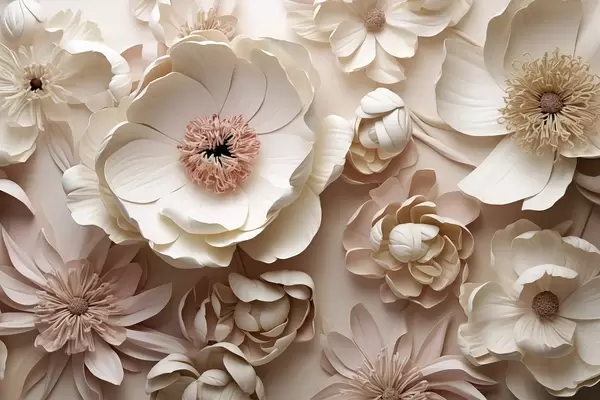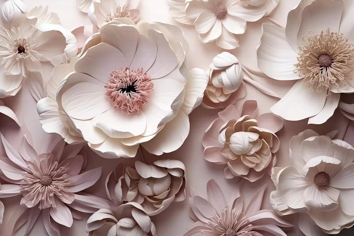 Murais de parede Composição floral volumétrica com pétalas delicadas, semelhantes a papel ou inspiradas em tecidos, em tons de marfim, baunilha e blush, em uma tela bege quente. Nr. w03945v1