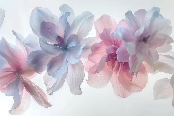 Murais de parede flores em tons pastéis hiper-realistas flutuando em um espaço branco, pétalas delicadas, iluminação etérea, obra de arte botânica detalhada, Nr. w03946