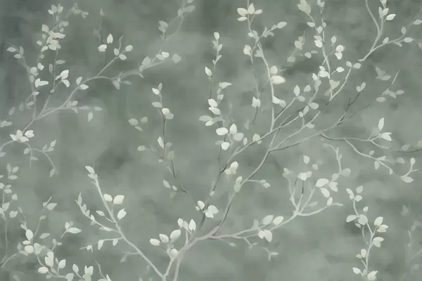 Murais de parede papel de parede minimalista pintado à mão com galhos de árvore brancos e macios com folhas delicadas, ramificando-se organicamente em um fundo verde-sálvia suave, com linhas botânicas finas em fluxo natural Nr. w03949v2