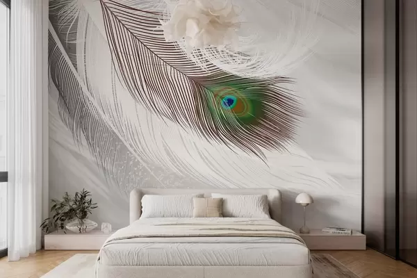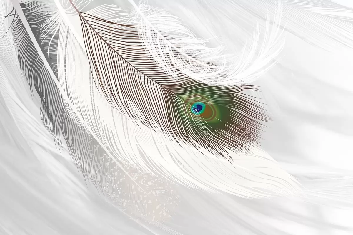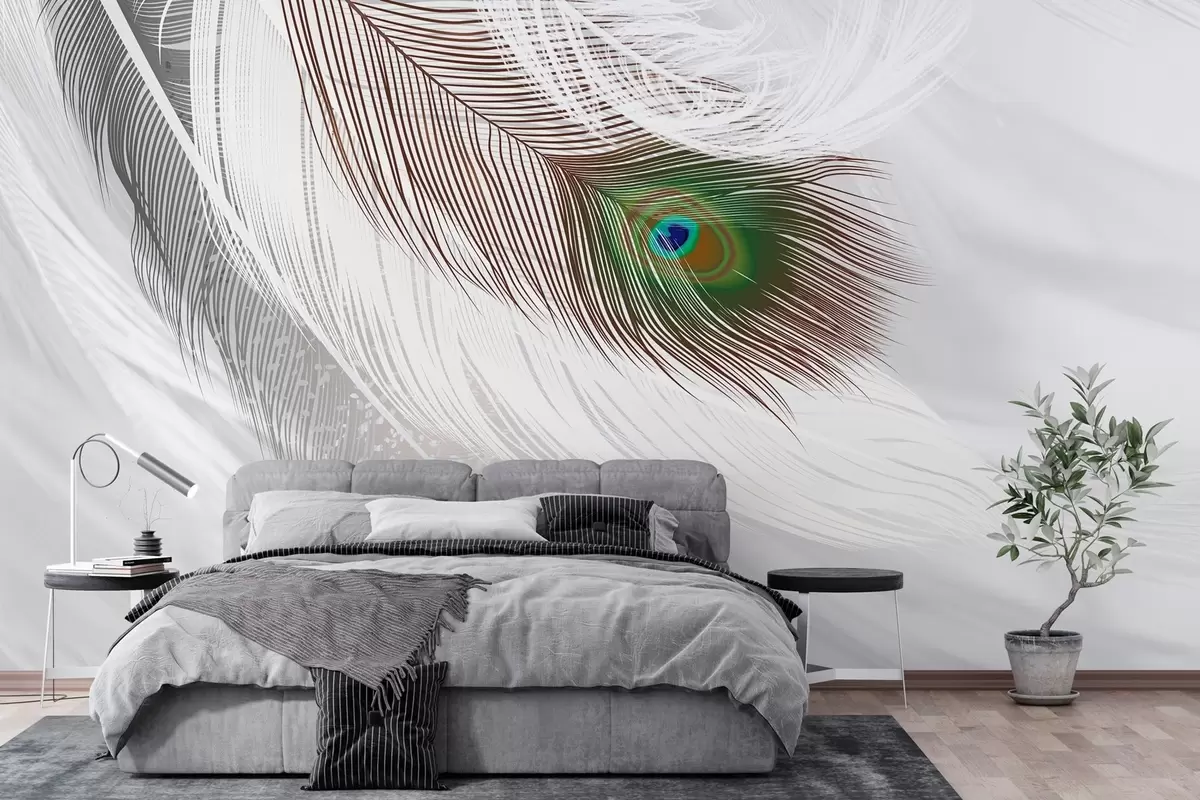 Murais de parede uma grande pena de pavão entre as penas Nr. w03961