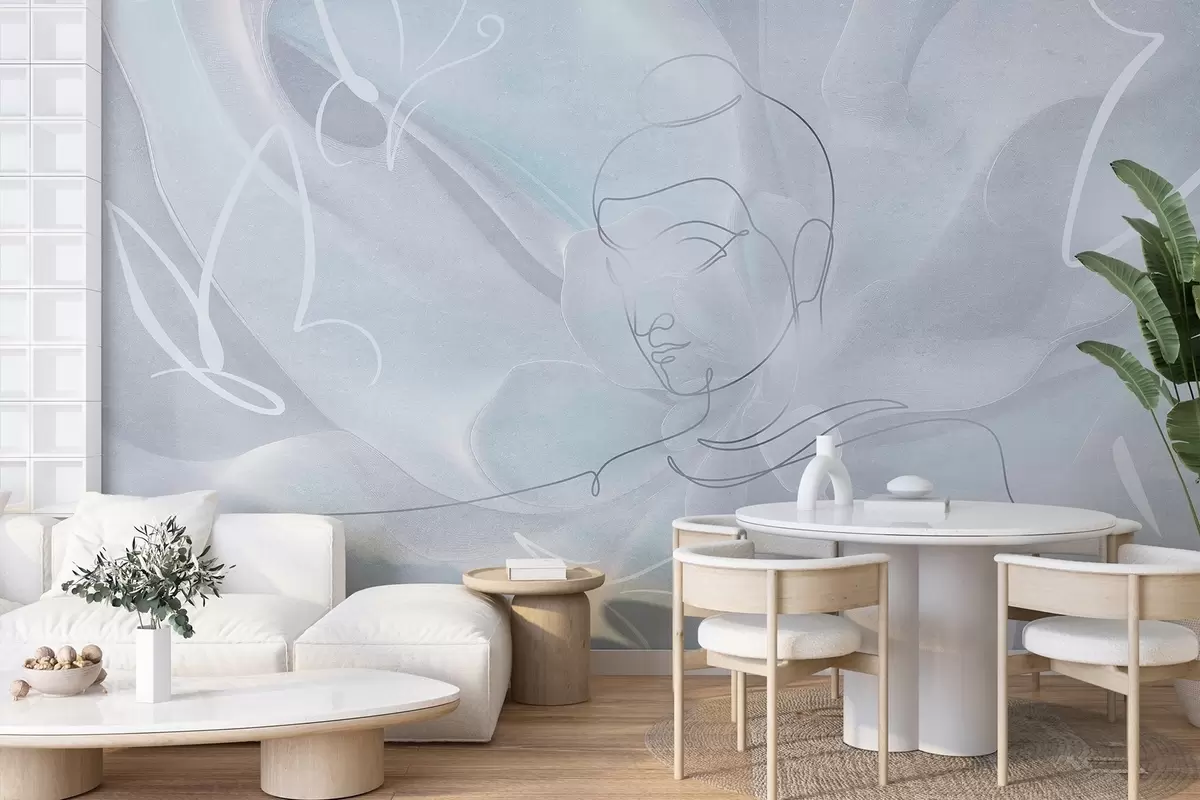murais de parede Abstração floral com desenho de linha do Buda, cores azuis w04004v1