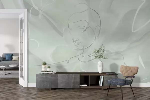 Murais de parede Abstração floral com desenho de linha do Buda, cores verdes Nr. w04004v3