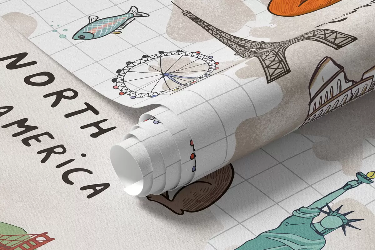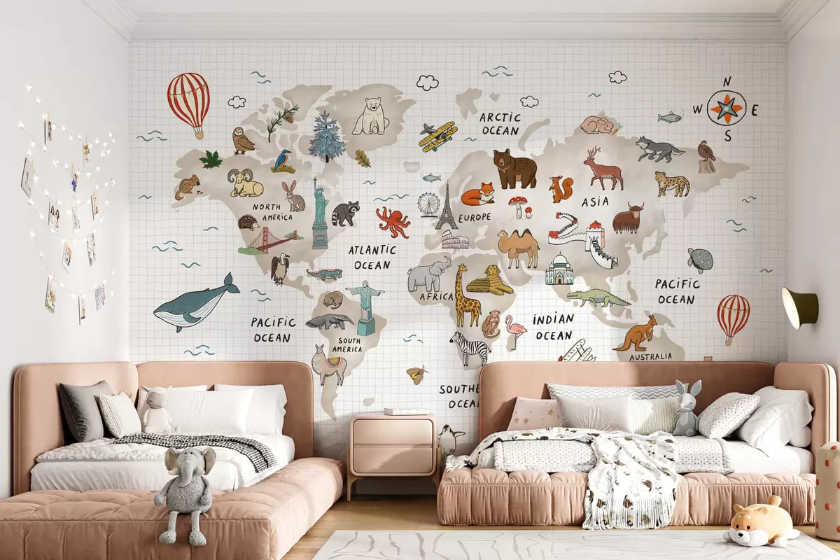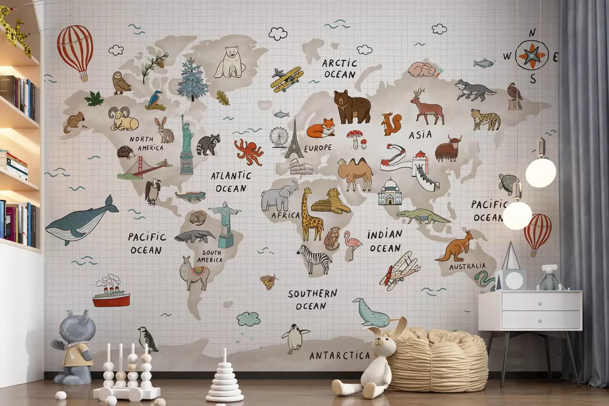 Murais de parede Mapa do mundo com animais e pontos de referência Nr. w04011