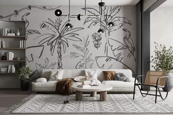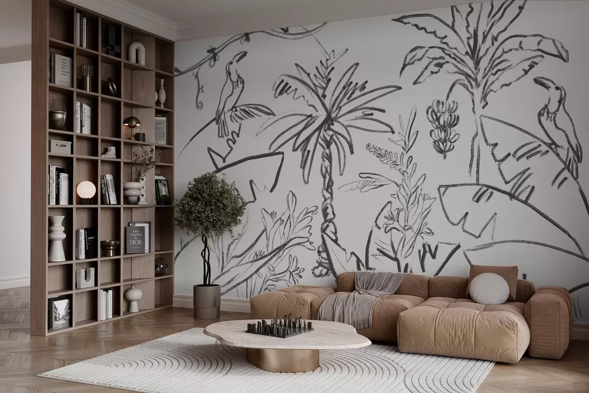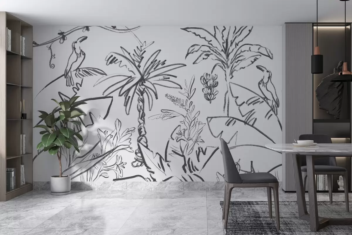 Murais de parede Desenho de linha tropical, bananas, palmeiras, gráficos de contorno Nr. w04020