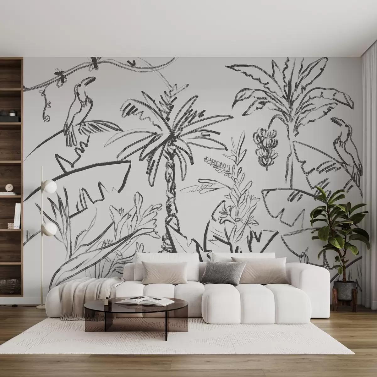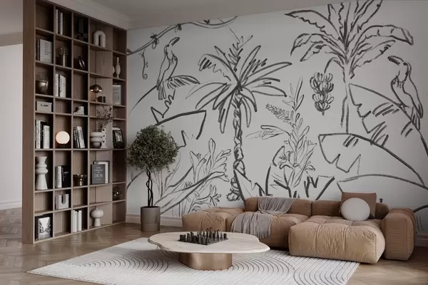 Murais de parede Desenho de linha tropical, bananas, palmeiras, gráficos de contorno Nr. w04020