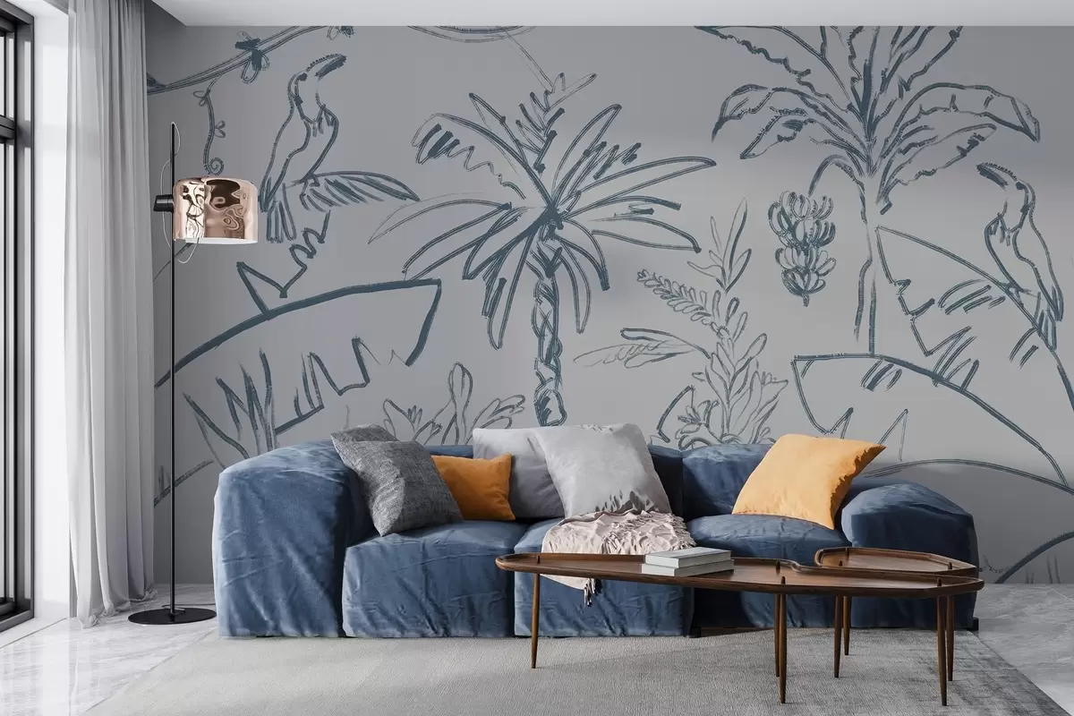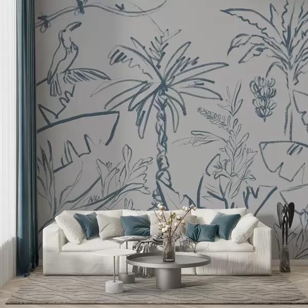 Murais de parede Padrão tropical em azul, bananas e palmeiras Nr. w04020v1