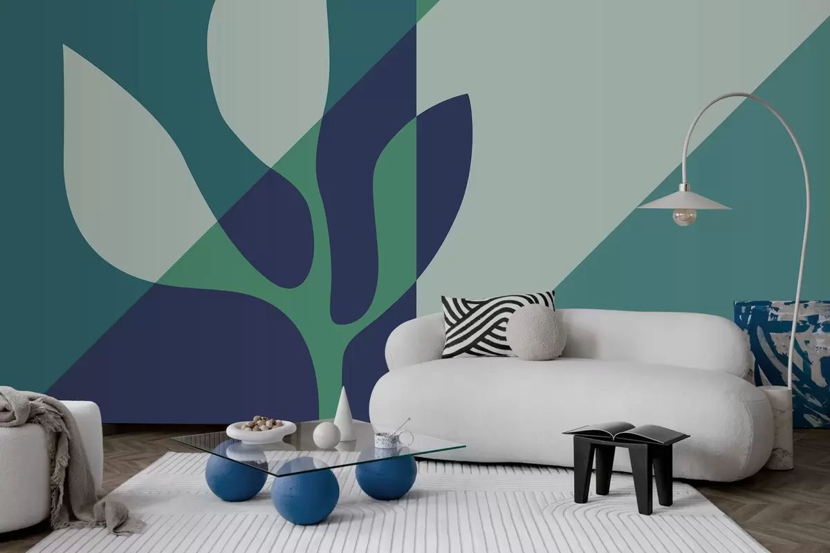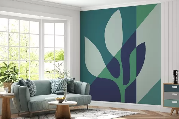 Murais de parede planta gráfica abstrata sobre o fundo de geometria em tons de azul Nr. w04028v1
