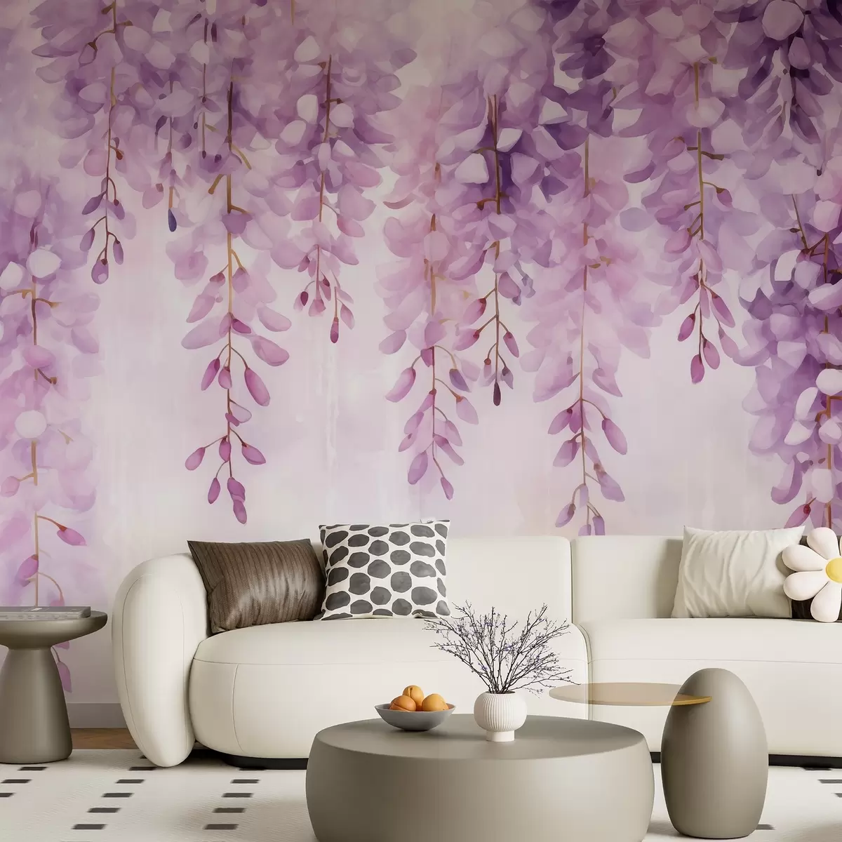 Murais de parede Composição delicada em aquarela com glicínias em cascata em tons suaves de lavanda e rosa, criando uma atmosfera pacífica, Nr. w04034
