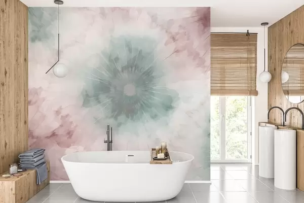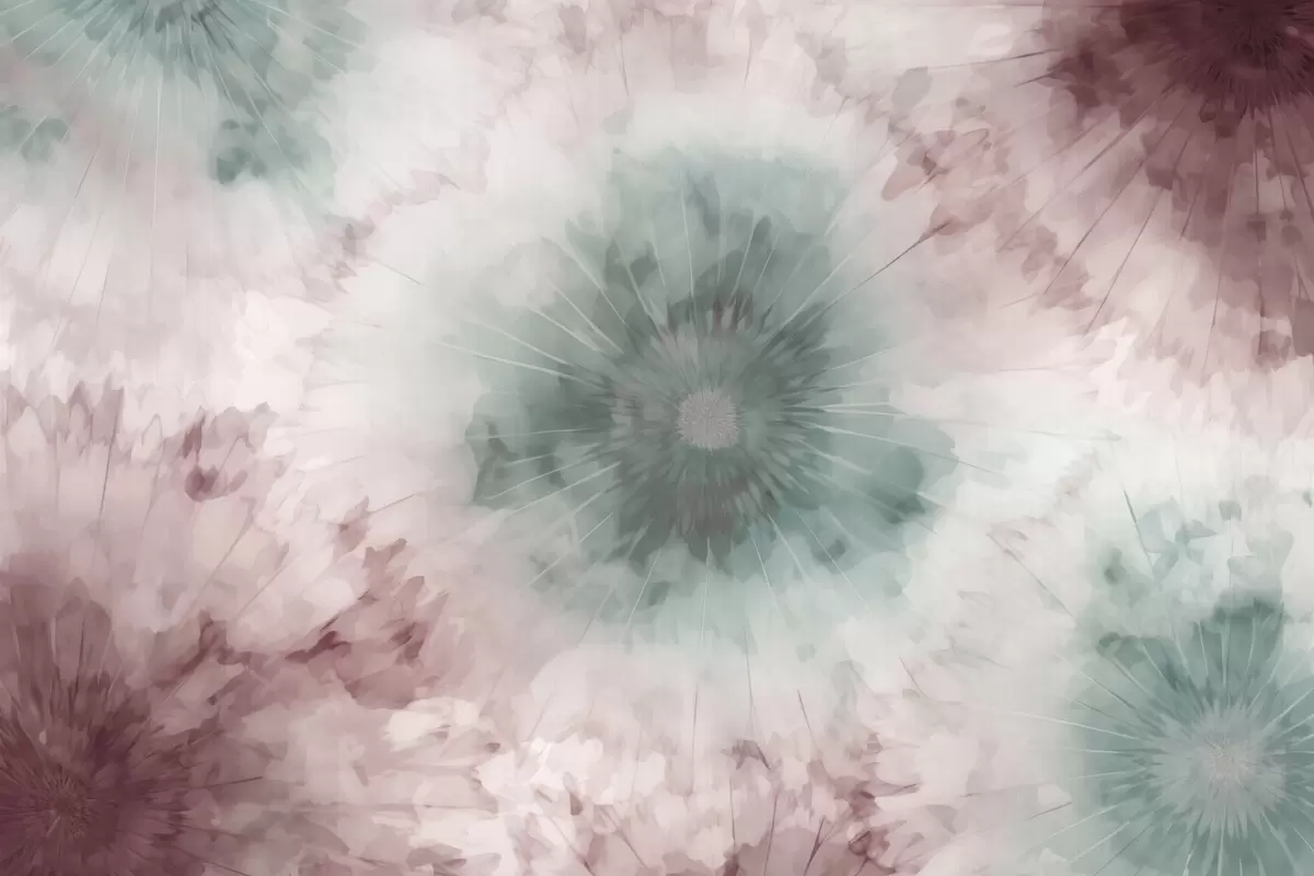 Murais de parede Padrão radial em aquarela misturando verdes enevoados e rosas empoeirados, evocando a suavidade do orvalho da manhã e o primeiro sopro do dia Nr. w04036v2