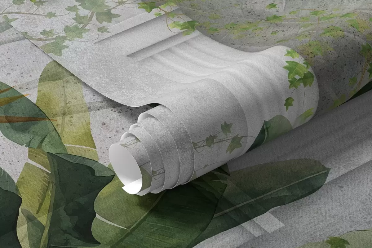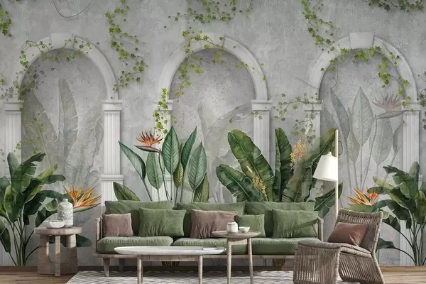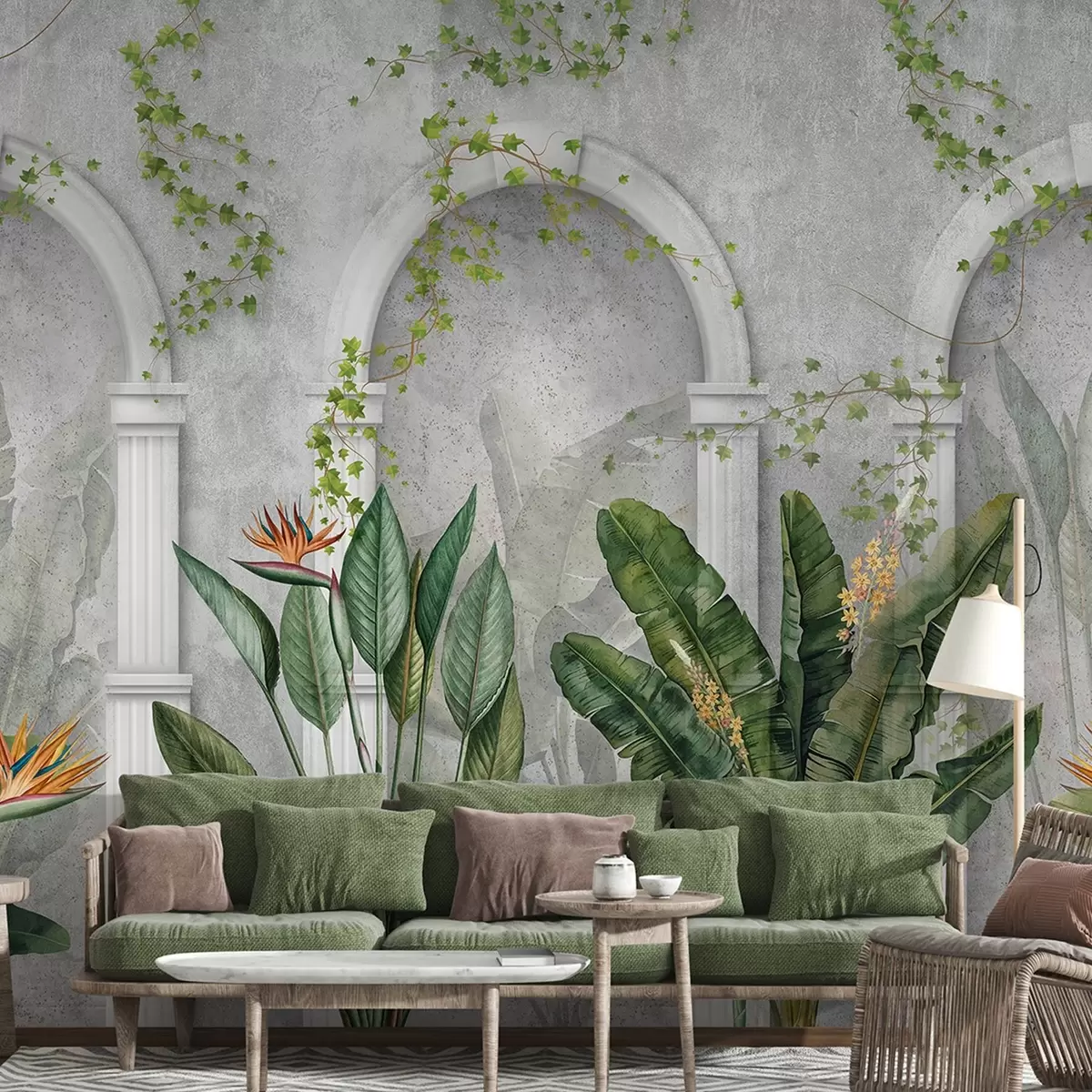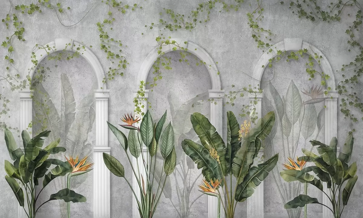 Murais de parede Parede de concreto com arcos e plantas tropicais, florais, cores naturais Nr. w04065