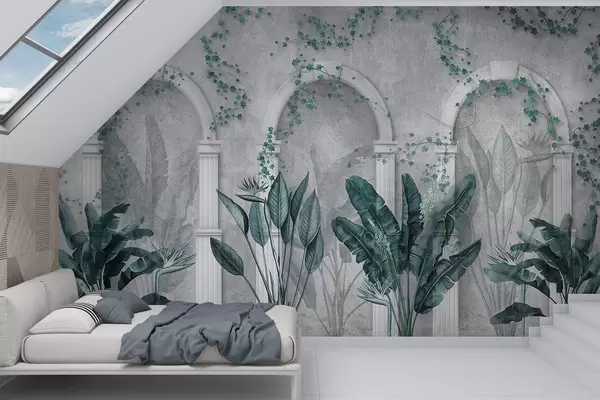 Murais de parede Parede de concreto com arcos e plantas tropicais, cores florais e azuis Nr. w04065v2