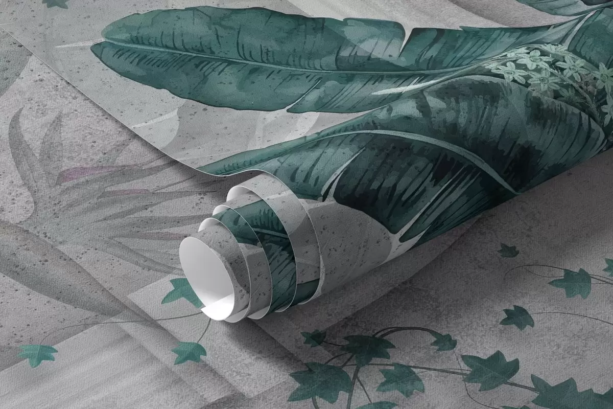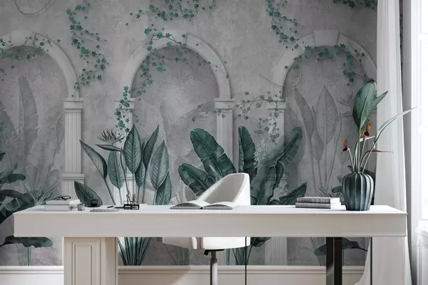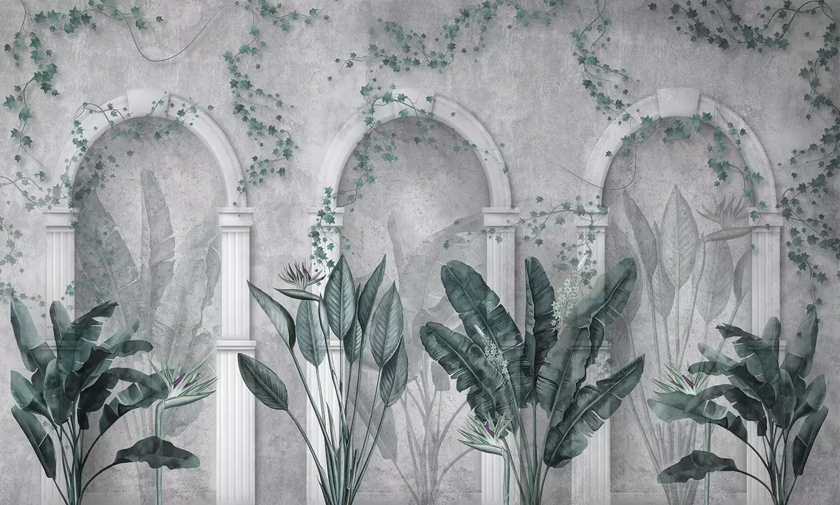 Murais de parede Parede de concreto com arcos e plantas tropicais, cores florais e azuis Nr. w04065v2