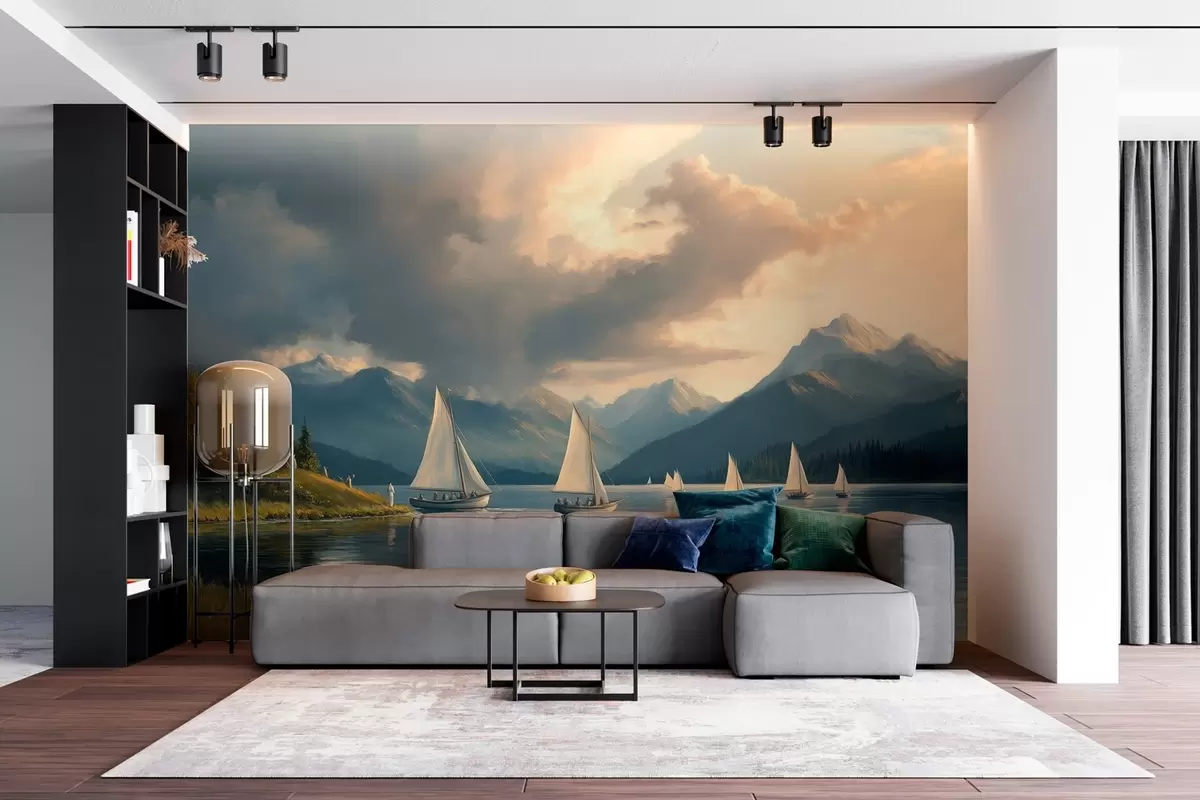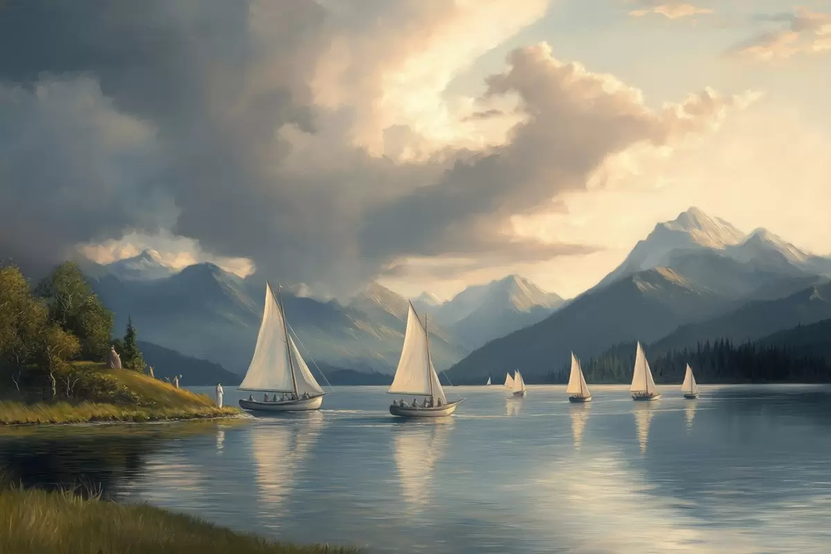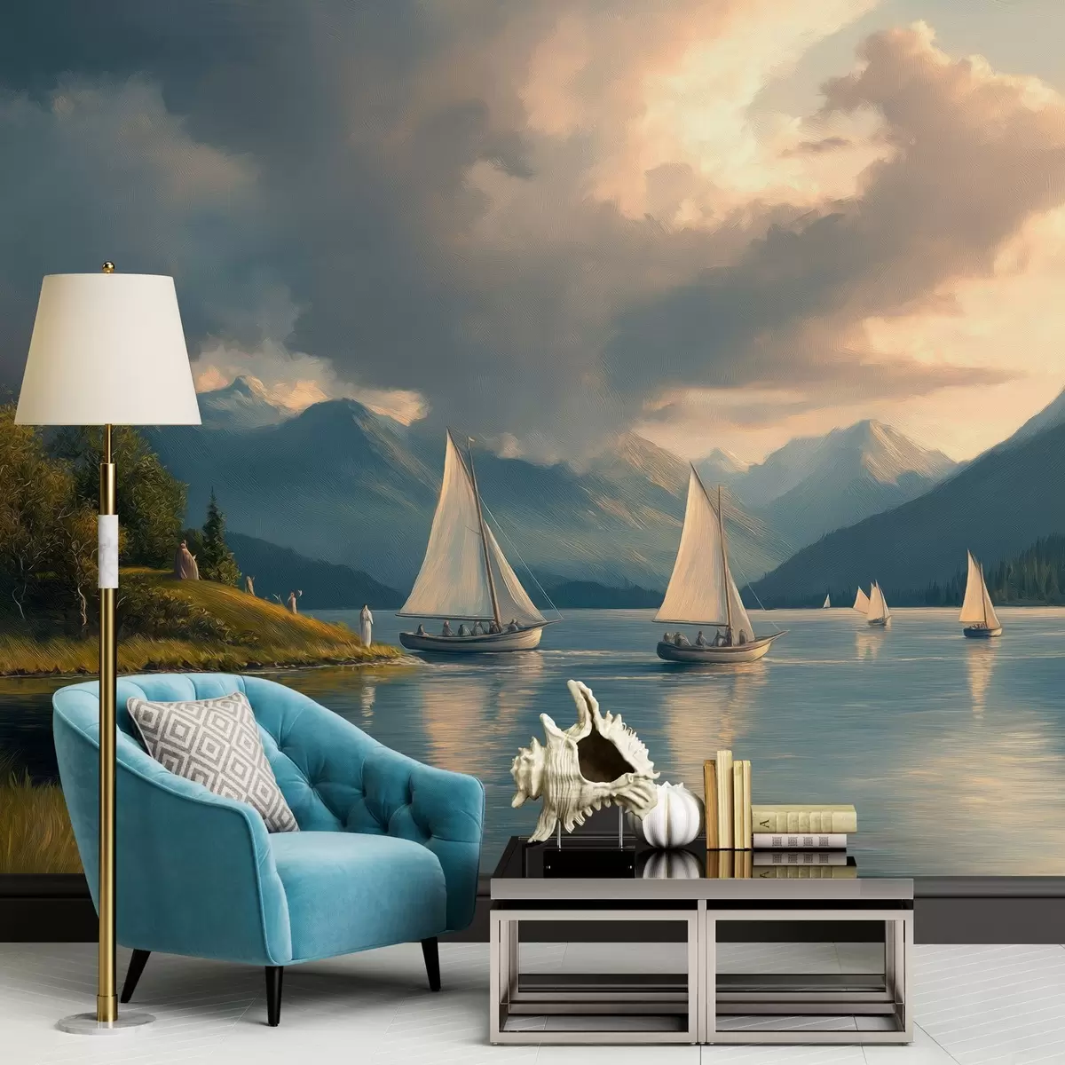 Murais de parede regata em um lago com um céu nublado no estilo de uma pintura a óleo do século XIX Nr. w04076