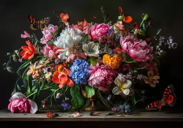 Murais de parede buquê no estilo da pintura a óleo holandesa do século XVII, com uma composição floral luxuosa. Nr. w04078