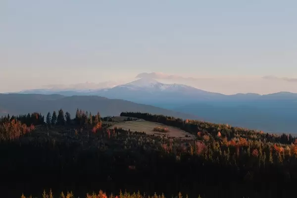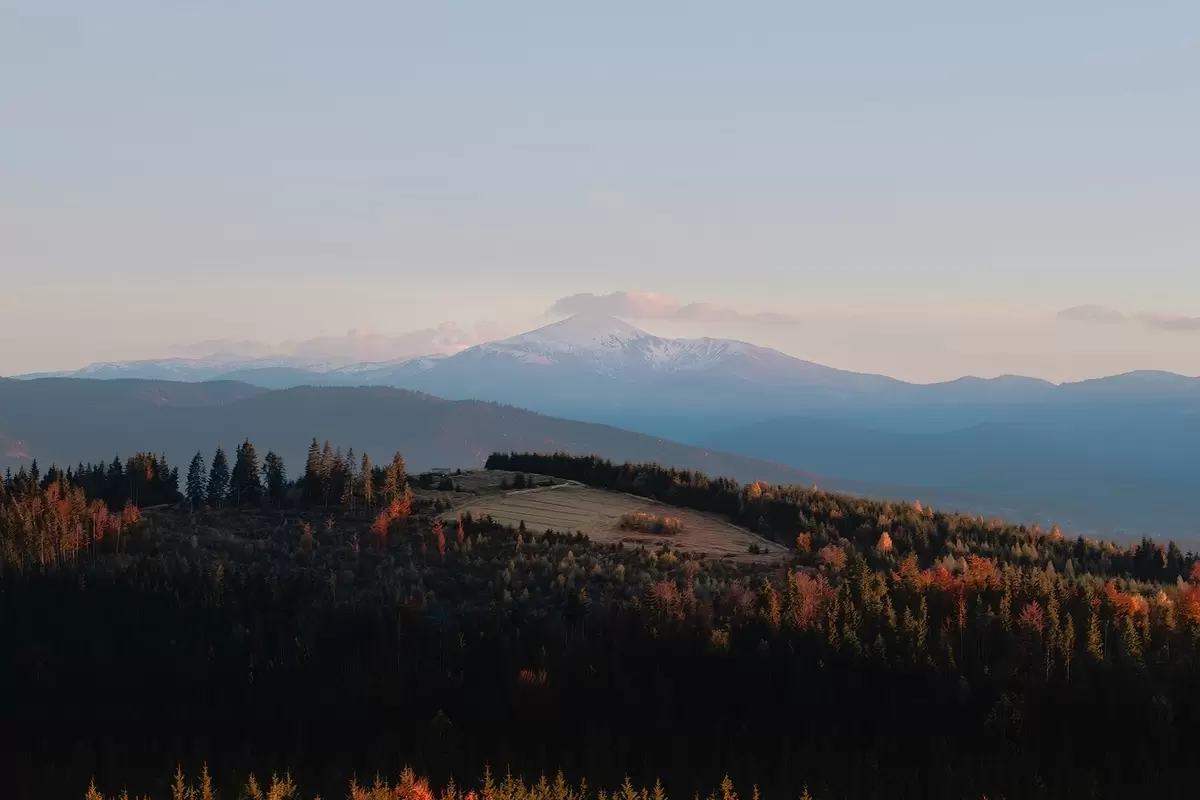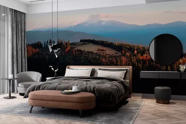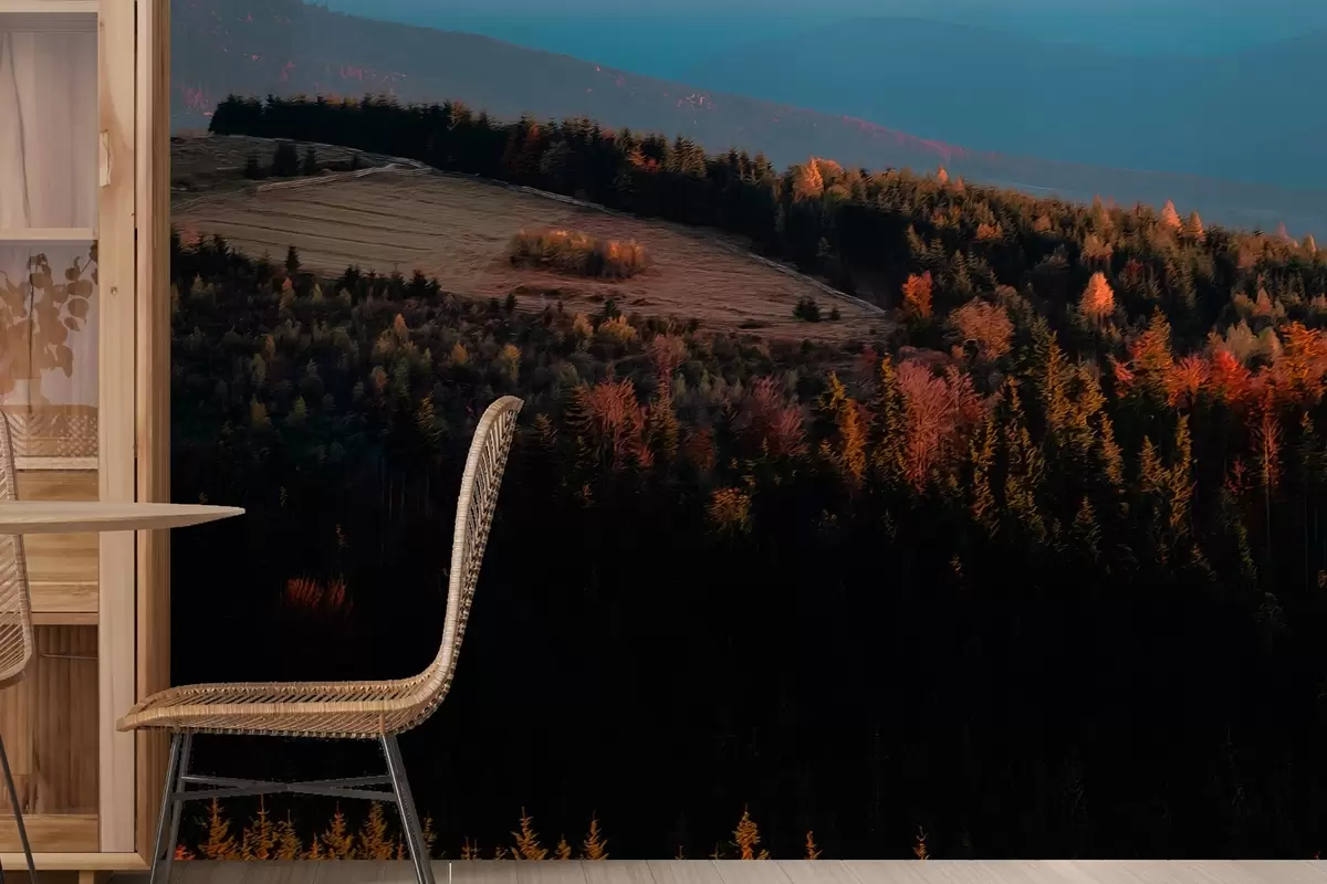 Murais de parede Montanhas dos Cárpatos, textura em estilo óleo, floresta de outono, céu ao pôr do sol Nr. w04098