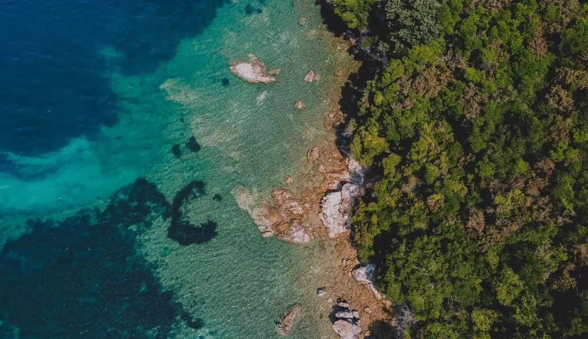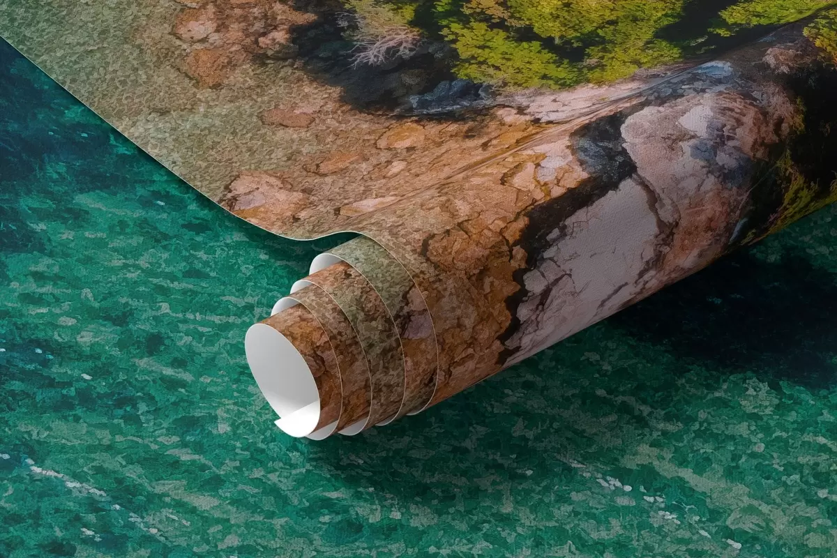 Murais de parede Costa marítima da Espanha com águas marinhas, floresta de pinheiros, fotografia aérea Nr. w04099
