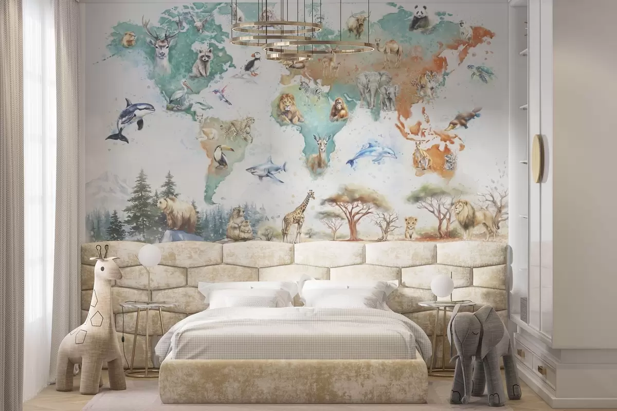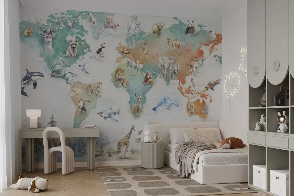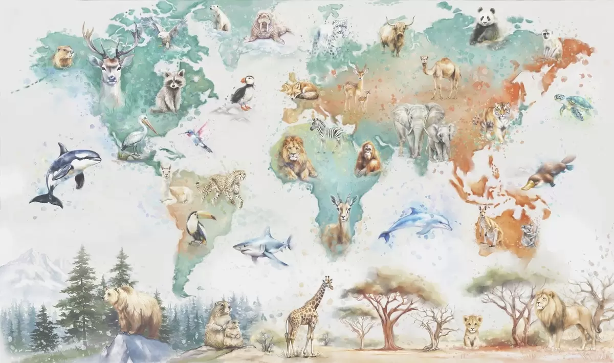 Murais de parede Mapa do mundo com animais, estilo de ilustração educacional para crianças Nr. w04148