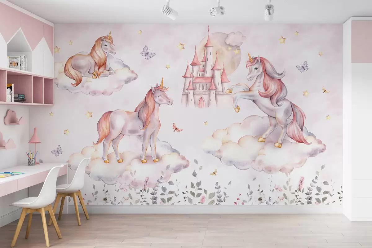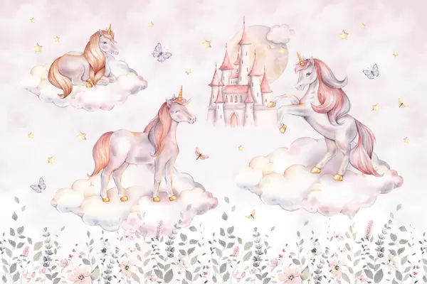 Murais de parede Unicórnios nas nuvens com estrelas, borboletas e flores Nr. w04165
