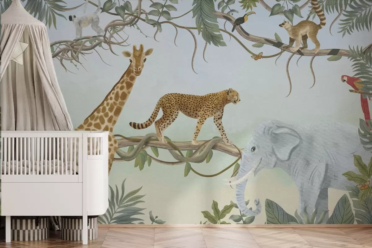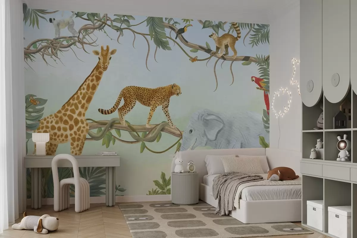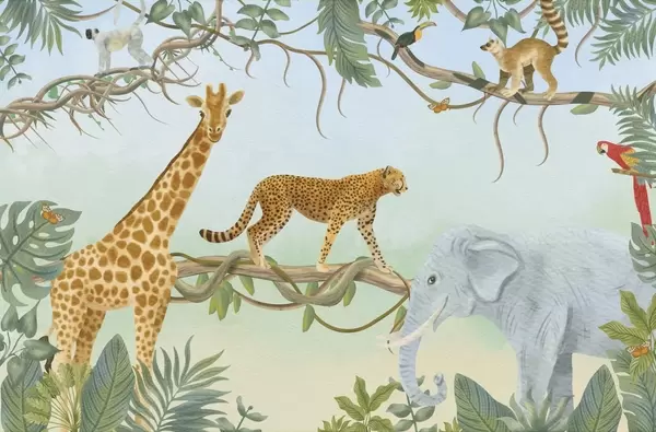 Murais de parede Ilustração da selva com girafa, guepardo e elefante Nr. w04194