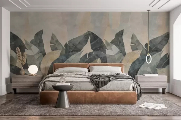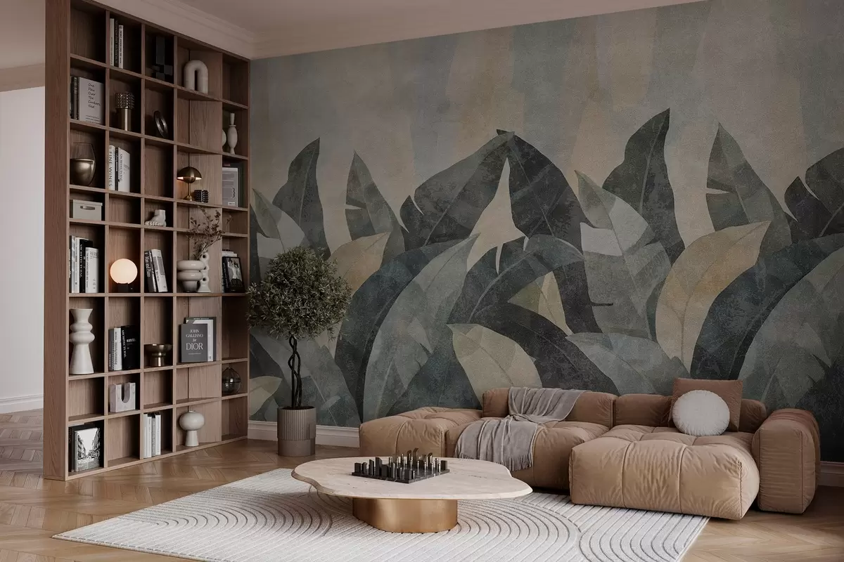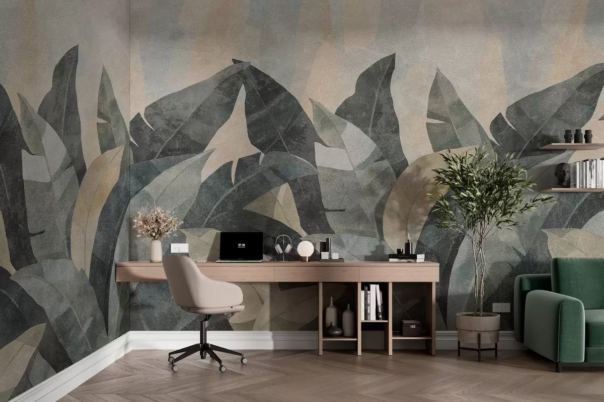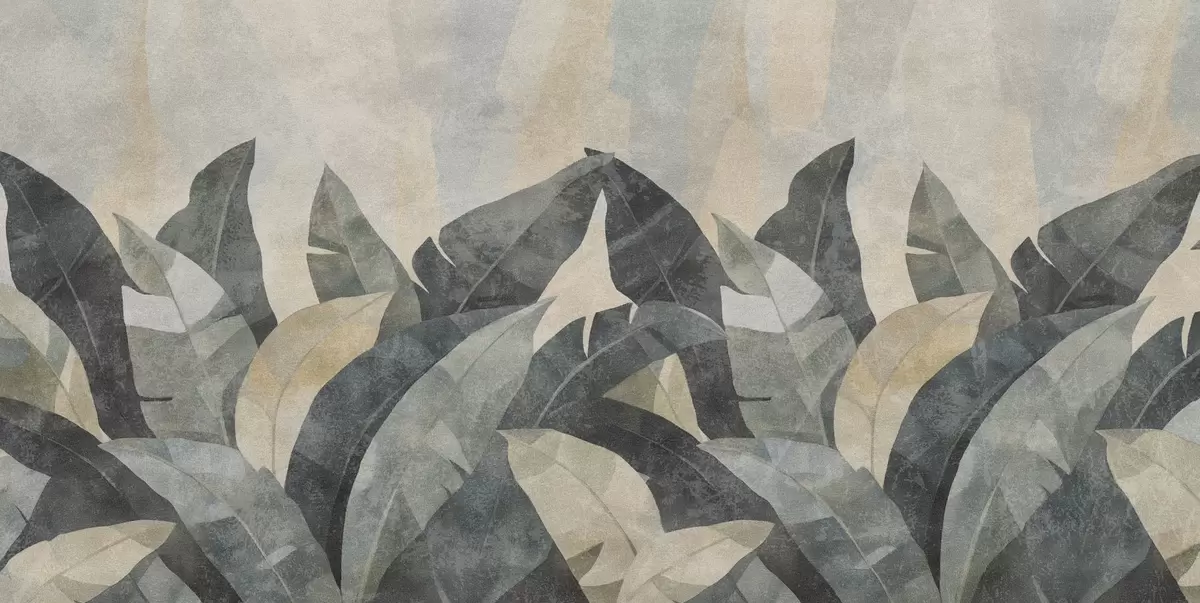 Murais de parede folhas de bananeira texturizadas em tons naturais de bege, verde e cinza Nr. w04285