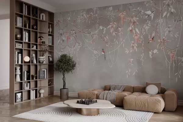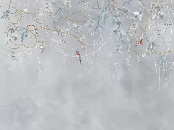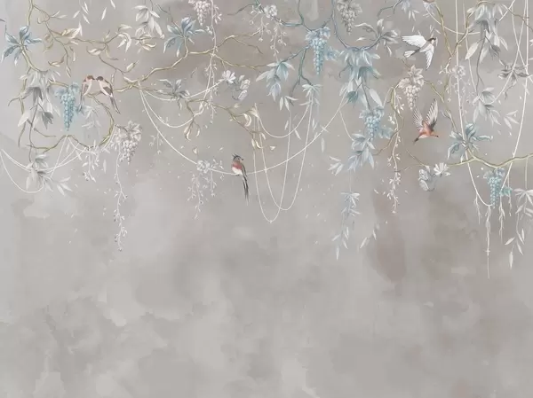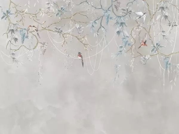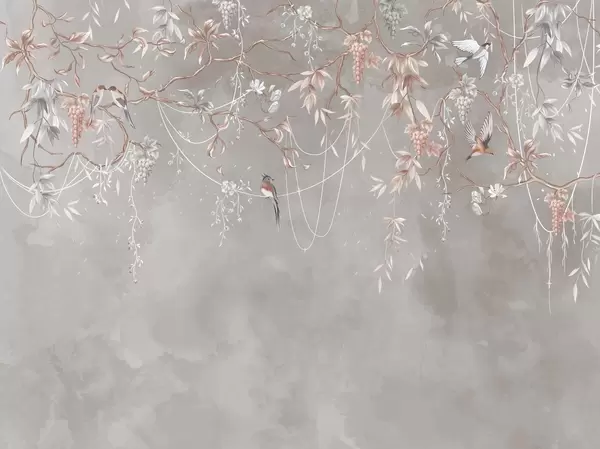 Murais de parede Galhos com uvas e pássaros em um fundo cinza-rosa quente Nr. w04302