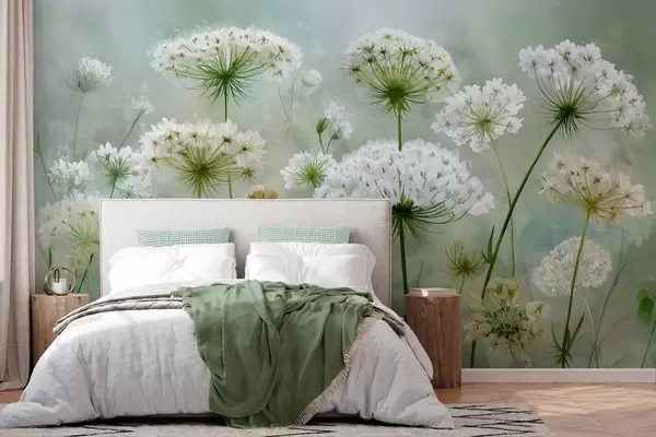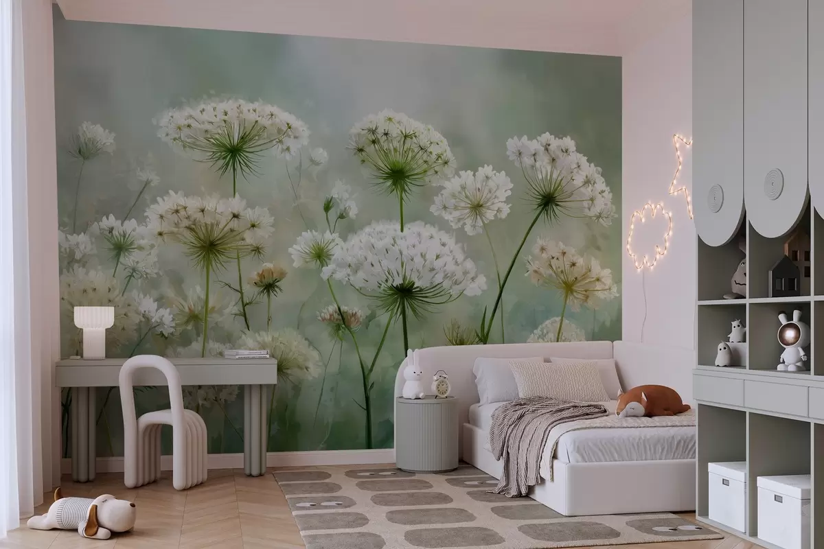 Murais de parede delicadas flores silvestres brancas Queen Anne, em um estilo pitoresco, tons verdes Nr. w04313