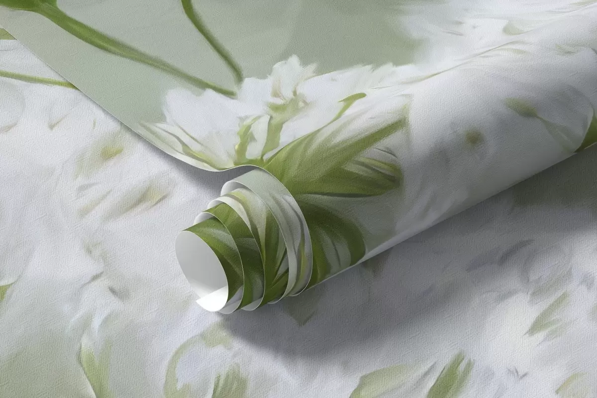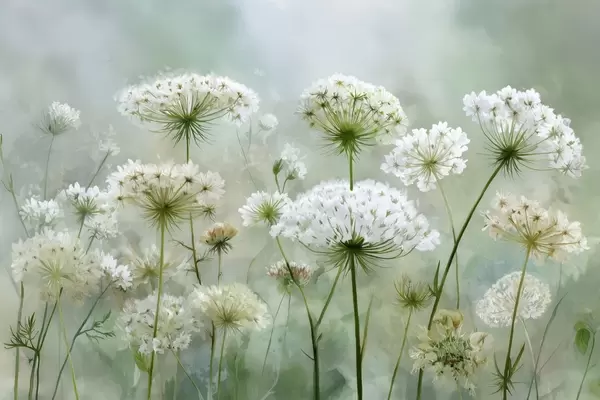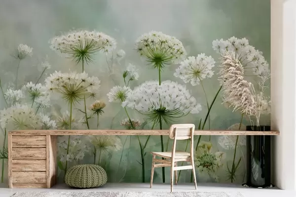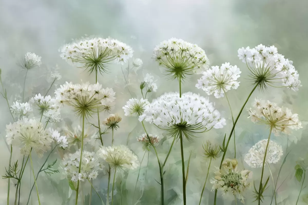 Murais de parede delicadas flores silvestres brancas Queen Anne, em um estilo pitoresco, tons verdes Nr. w04313