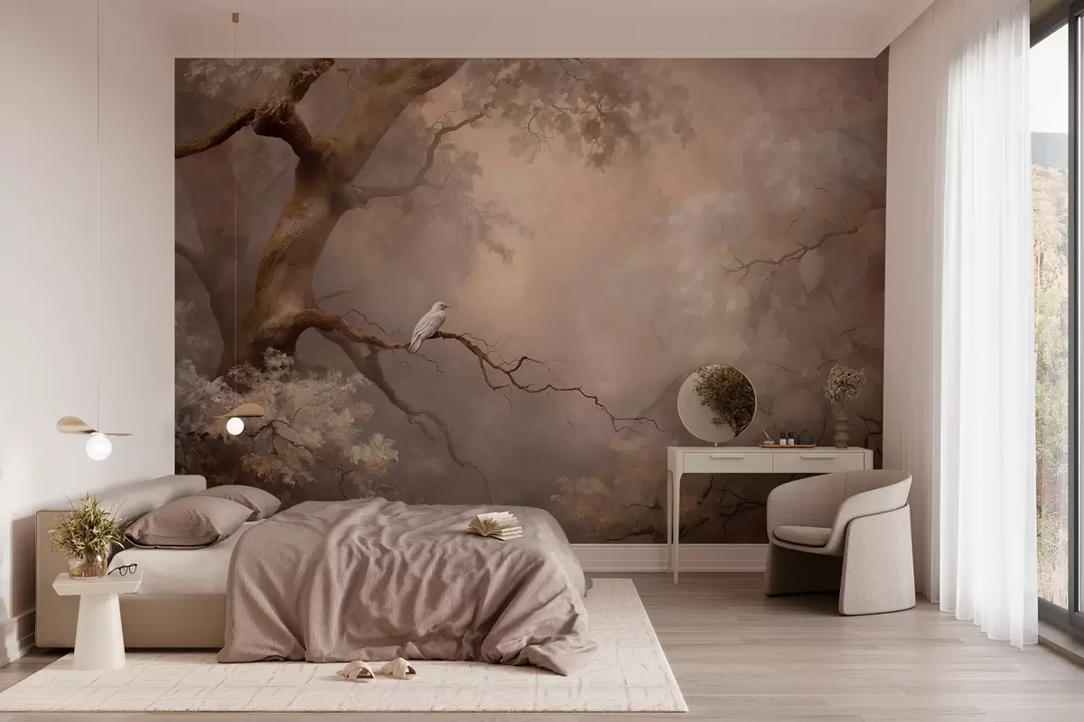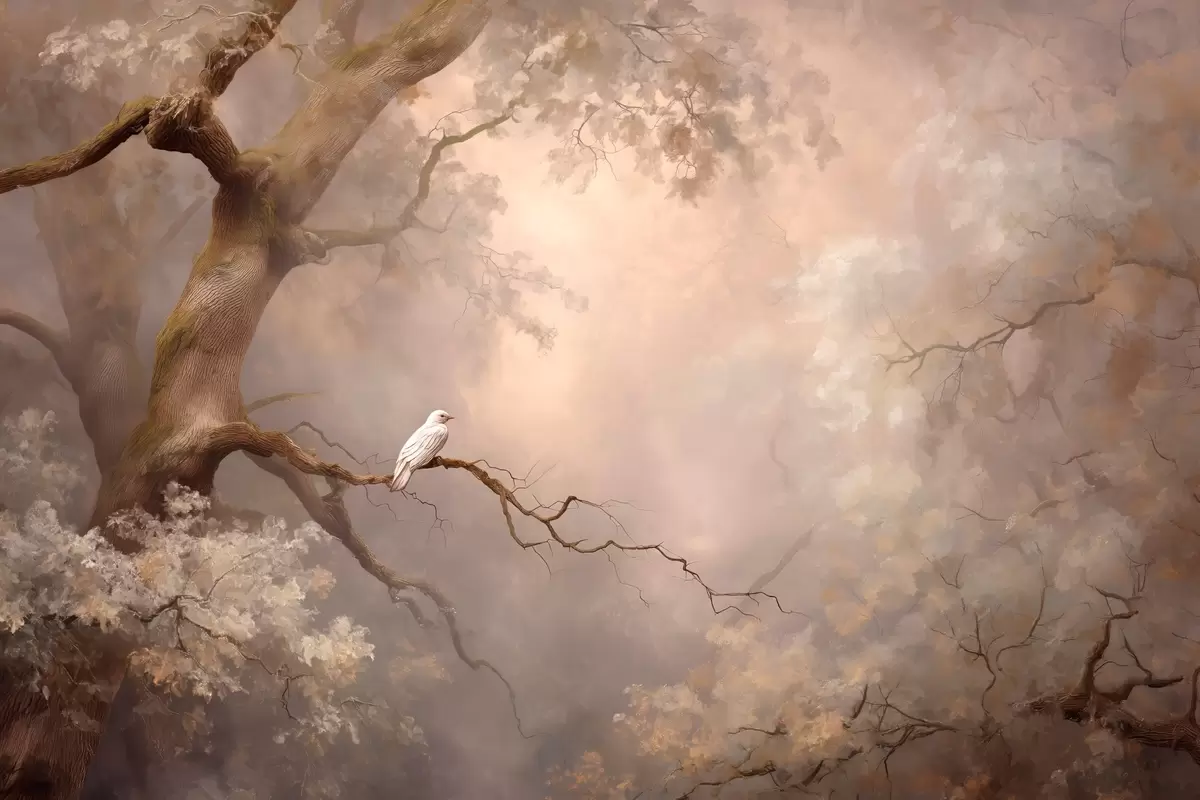 Murais de parede floresta mística com um pássaro branco Nr. w04314