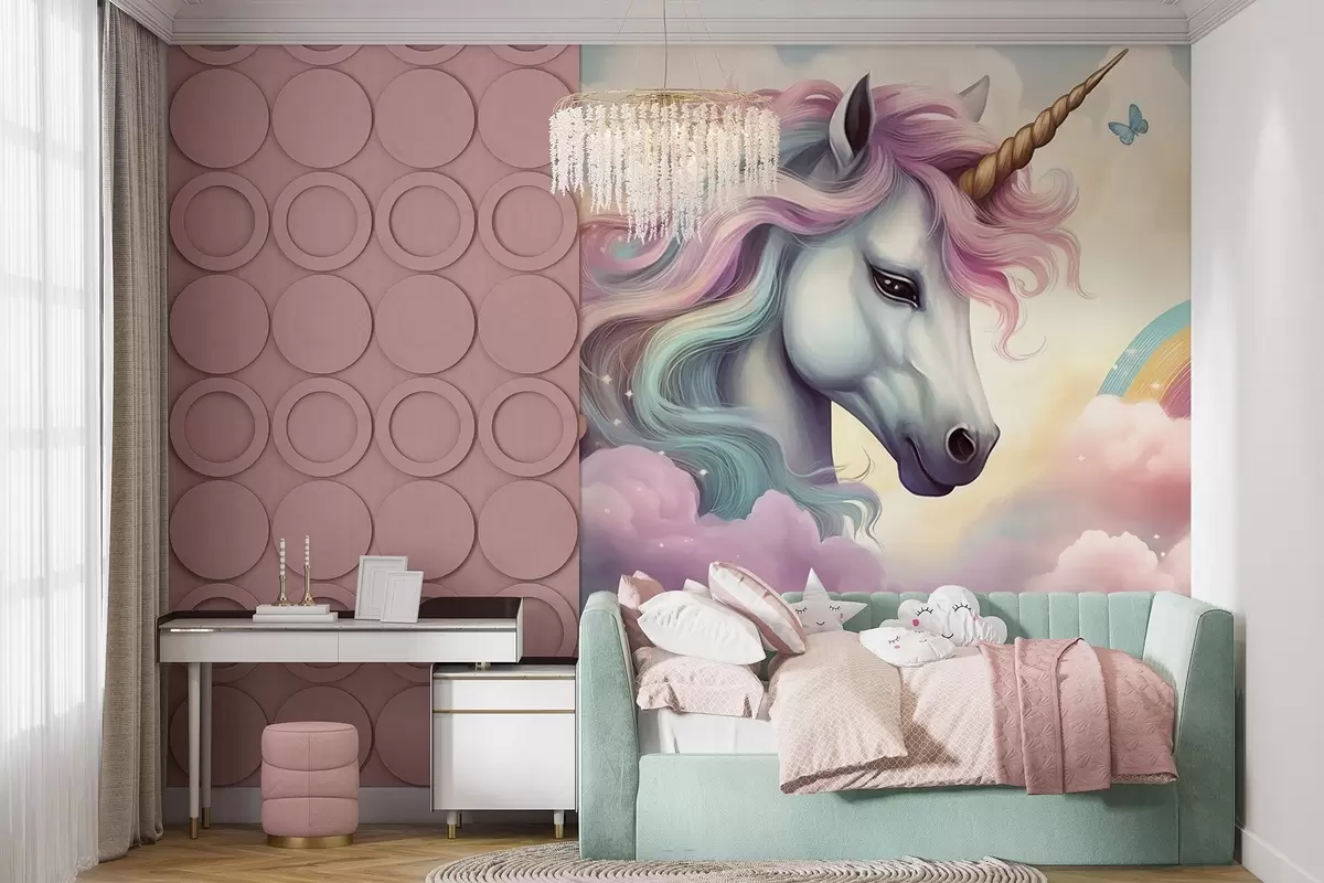 Murais de parede Unicórnio em um céu nublado com um arco-íris Nr. w04372