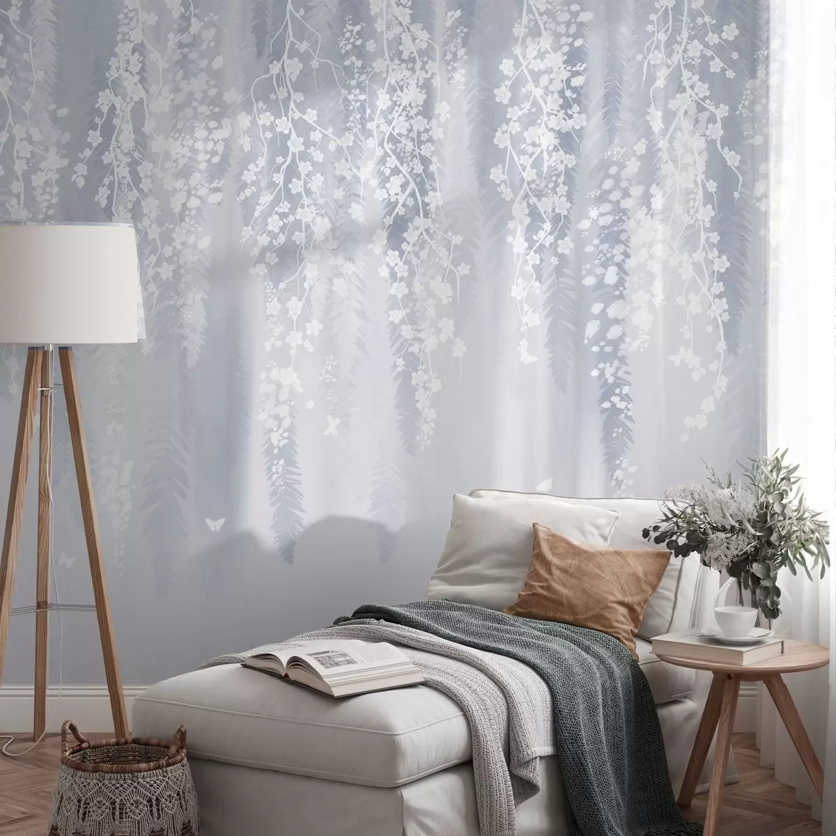 Murais de parede Versão azul de galhos com flores brancas Nr. w04417v2