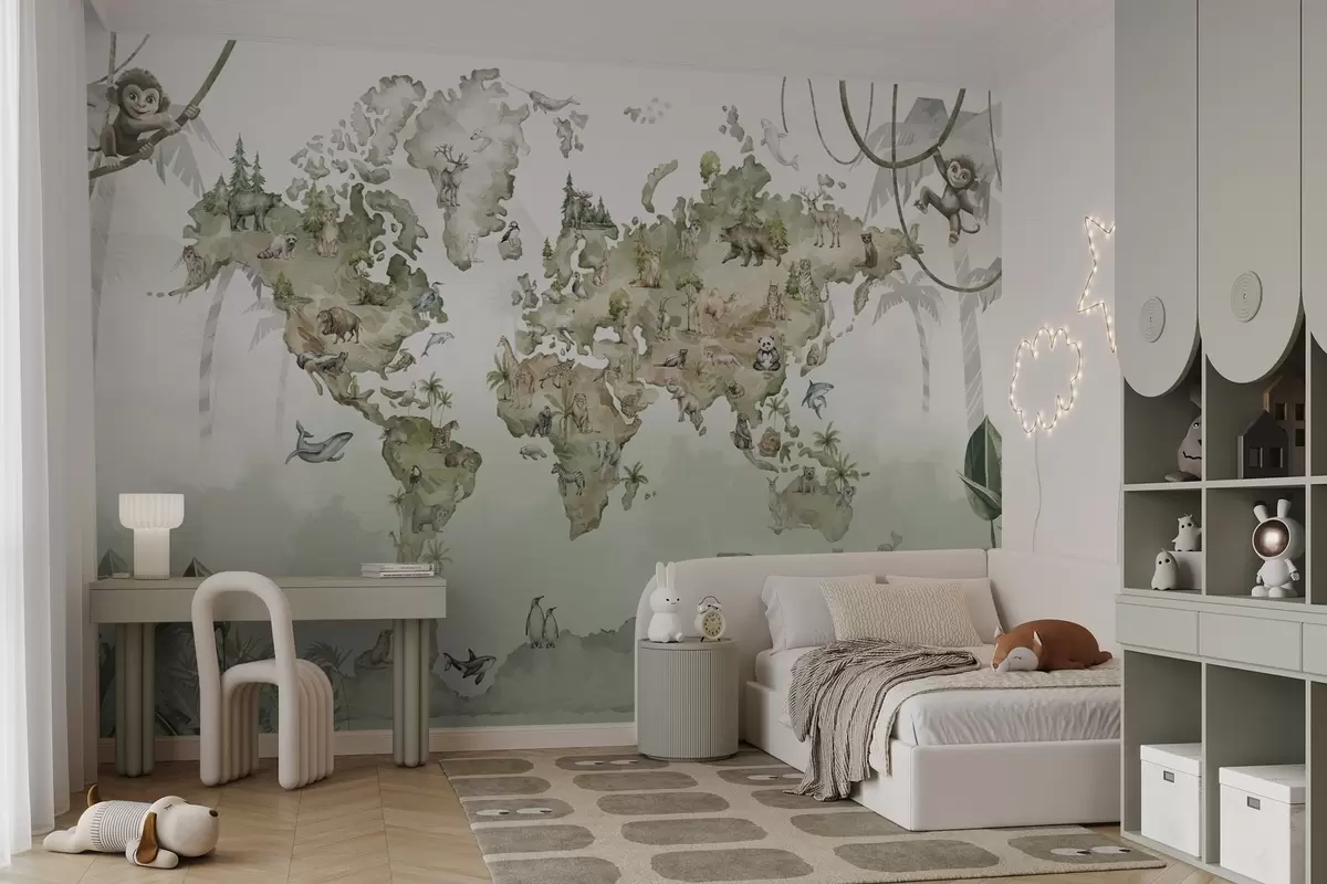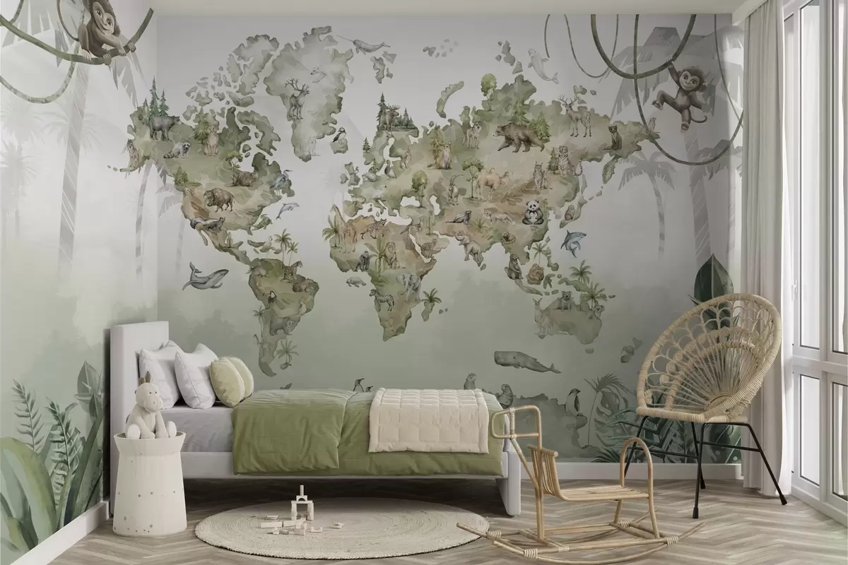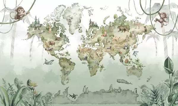 Murais de parede Mapa-múndi ilustrado com animais e selvas Nr. w04418v1