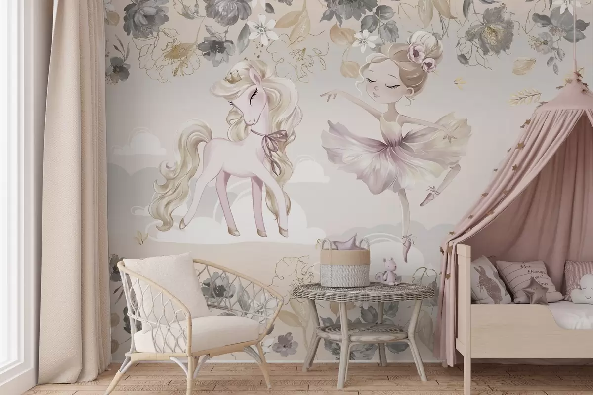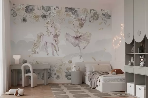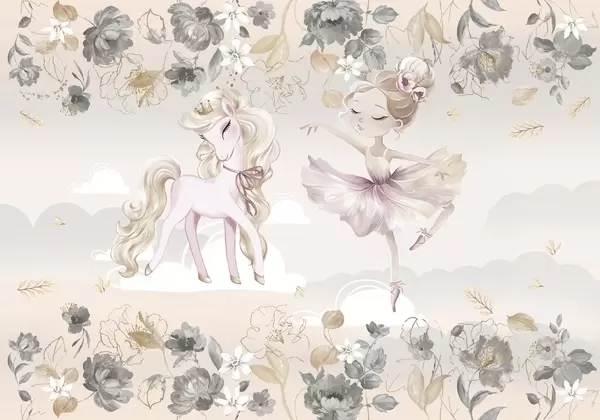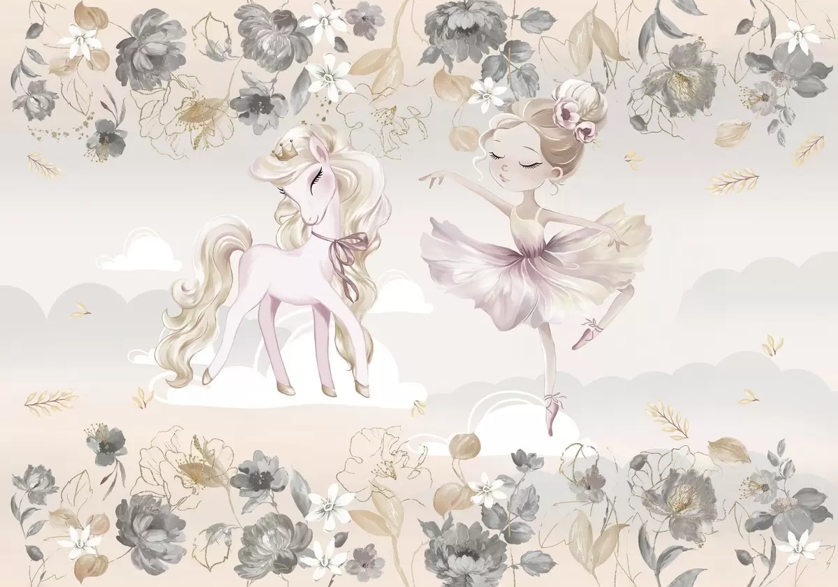 Murais de parede Pônei branco como a neve e bailarina entre flores e nuvens Nr. w04419