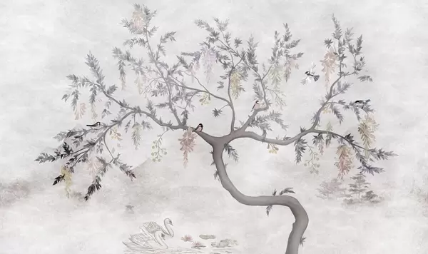 Murais de parede Galho de árvore com pássaros em estilo oriental Nr. w04456
