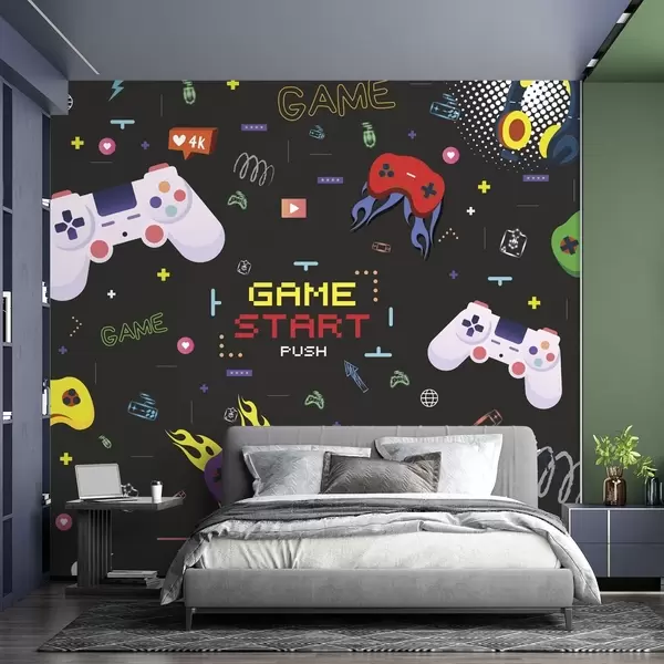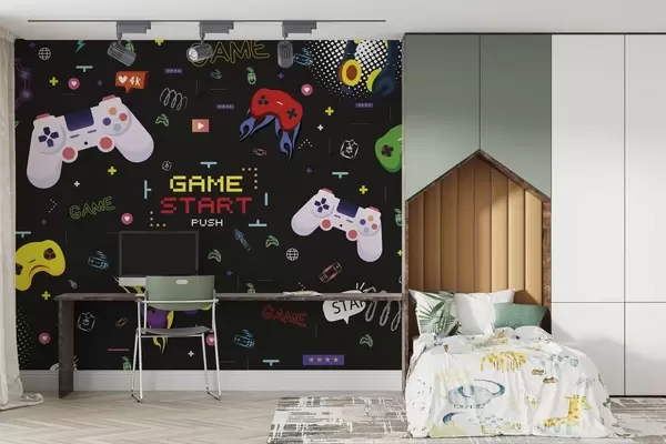 Murais de parede Padrão brilhante para gamers com consoles e texto pixelizado Nr. w04581