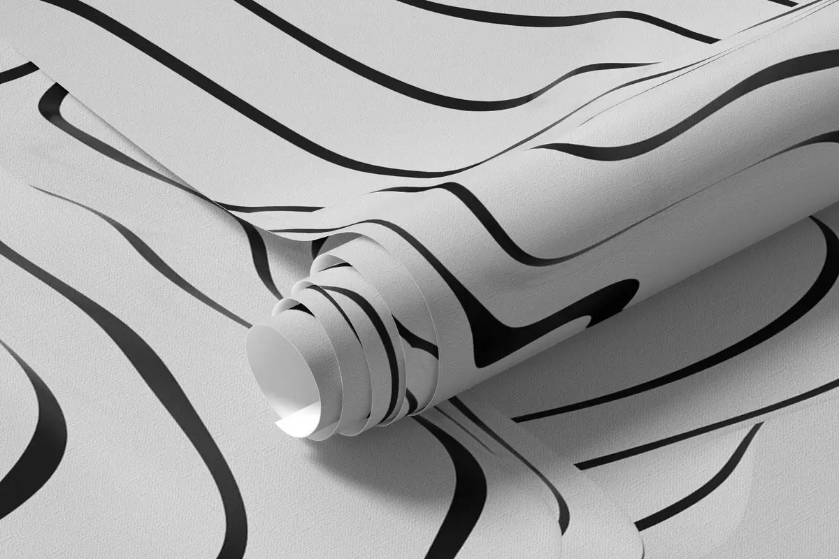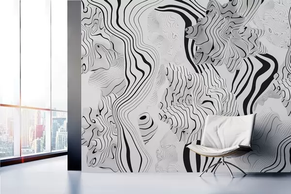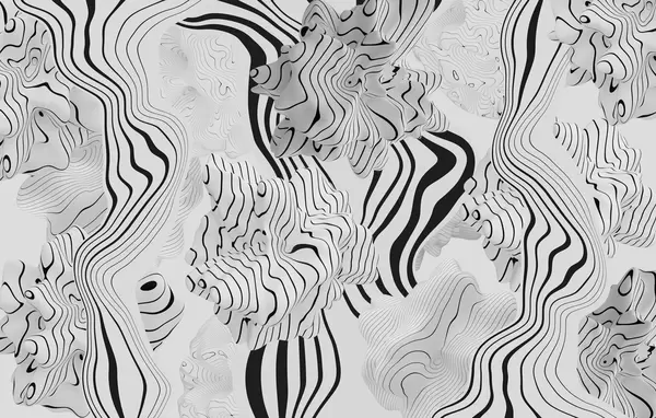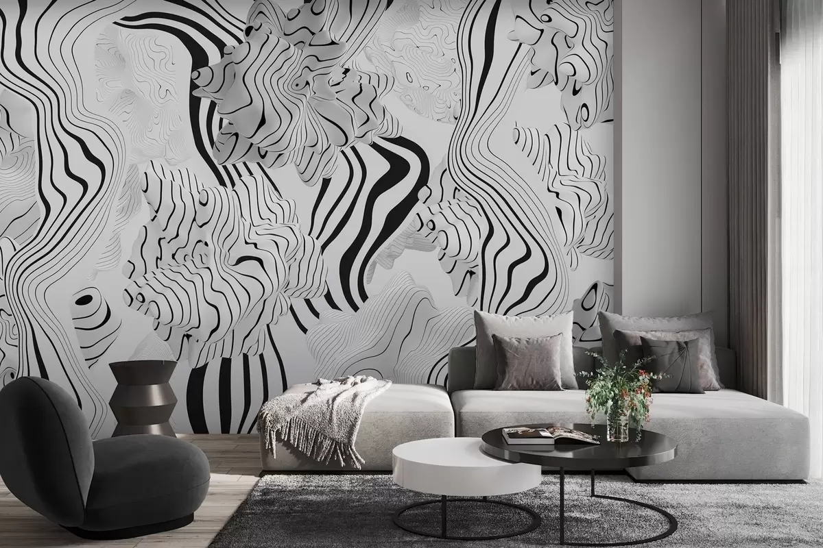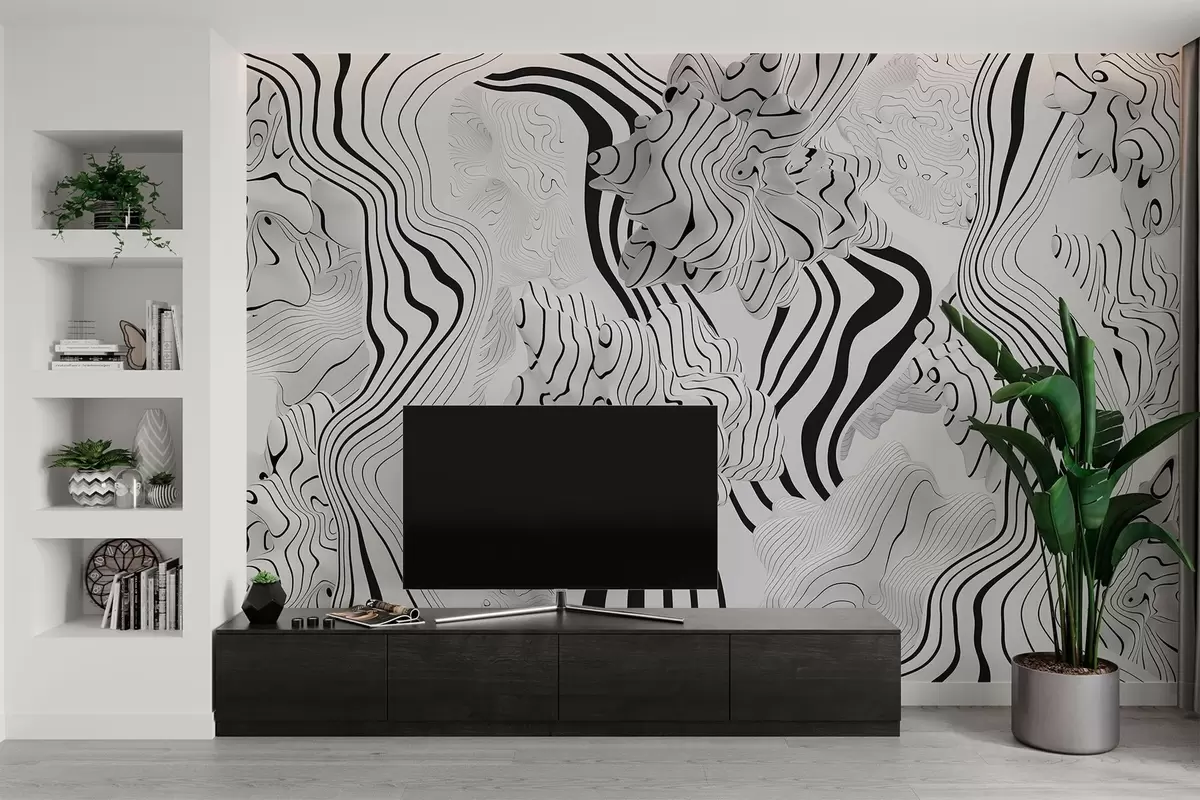 Murais de parede formas orgânicas abstratas em estilo 3D em tons de branco e cinza com listras pretas Nr. w04627