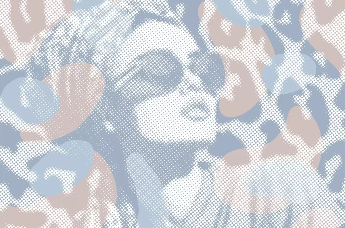 Murais de parede retrato de uma mulher sobre um fundo de leopardo em estilo pontilhado em tons de azul Nr. w04630v1