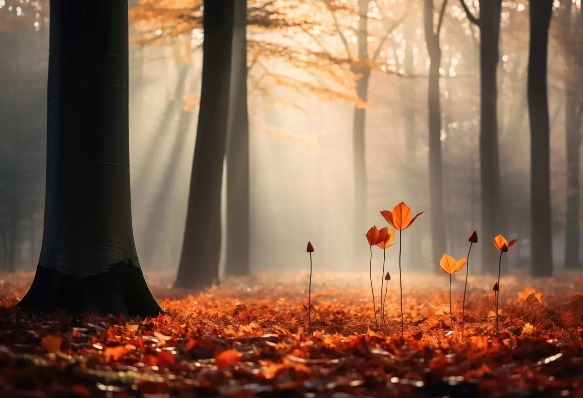 Murais de parede Floresta no outono com raios de sol e folhagem brilhante Nr. w04710