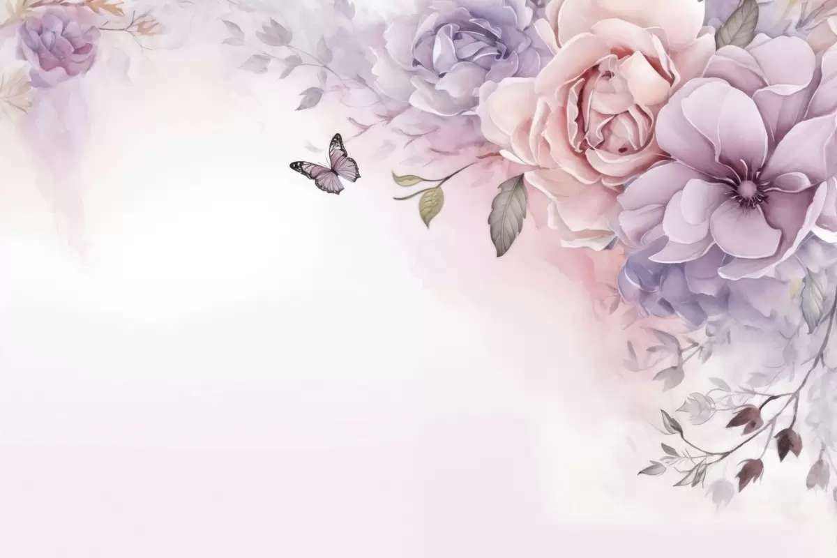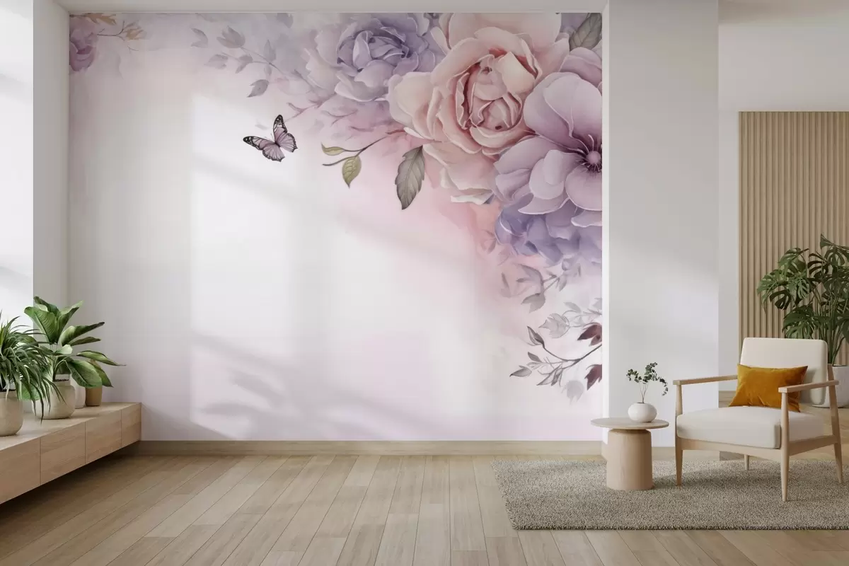 Murais de parede Delicadas flores rosa e lilás com uma borboleta Nr. w04711