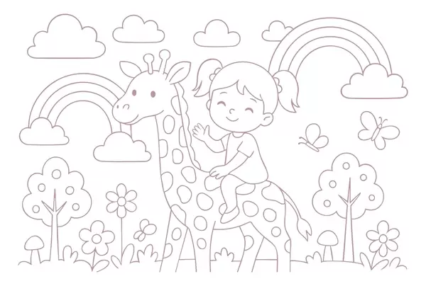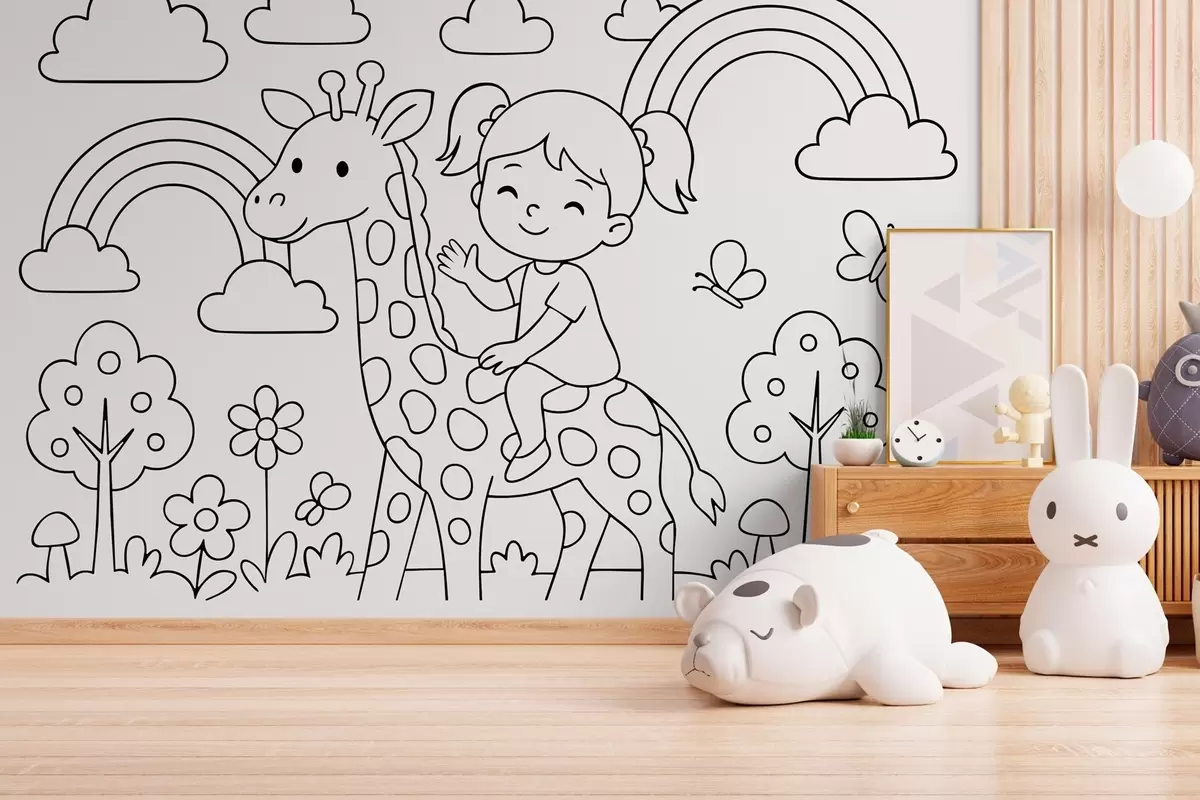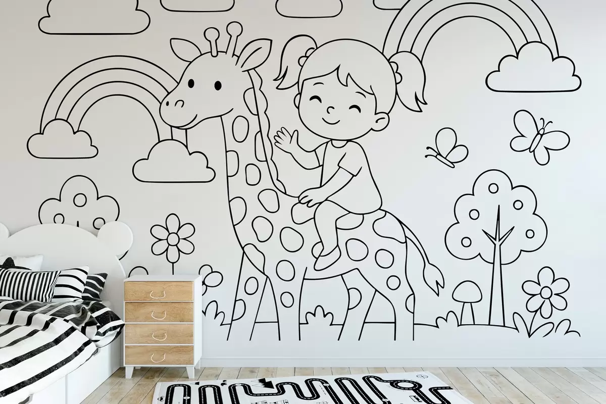 Murais de parede desenho a preto e branco de uma menina em cima de uma girafa, ao estilo de um livro de colorir infantil Nr. w04753
