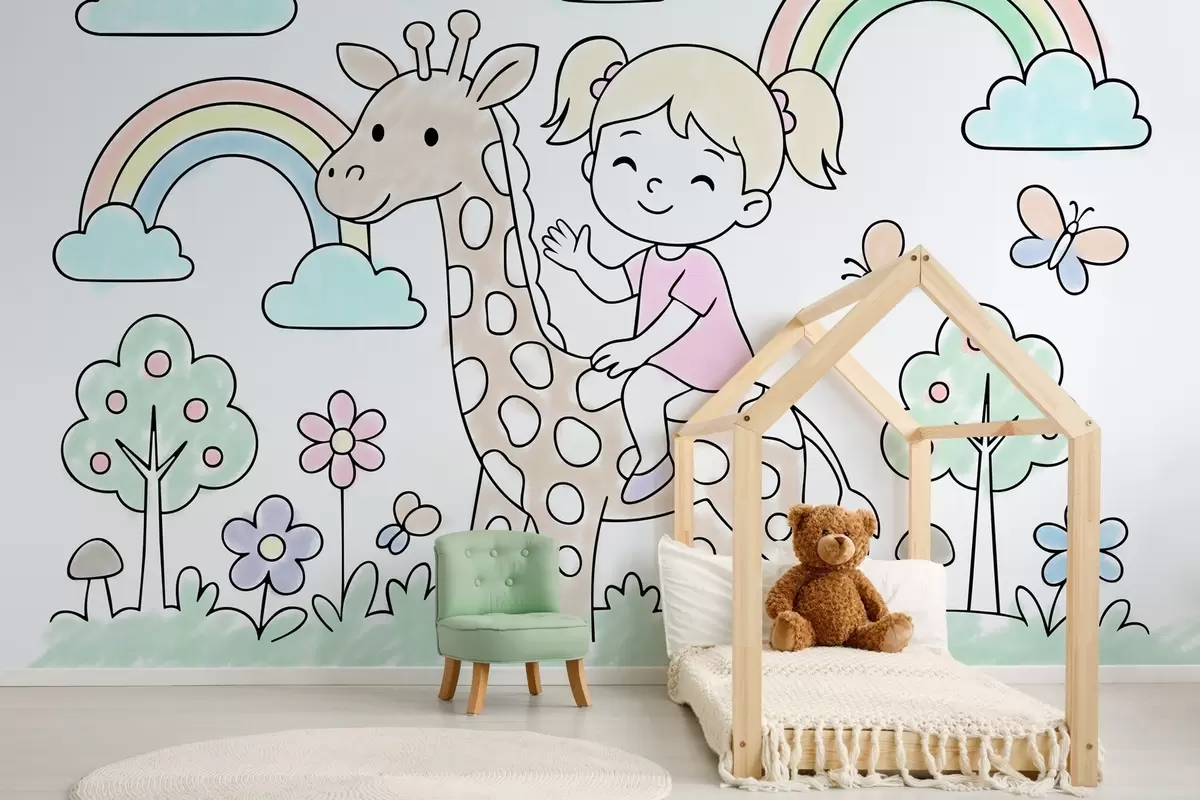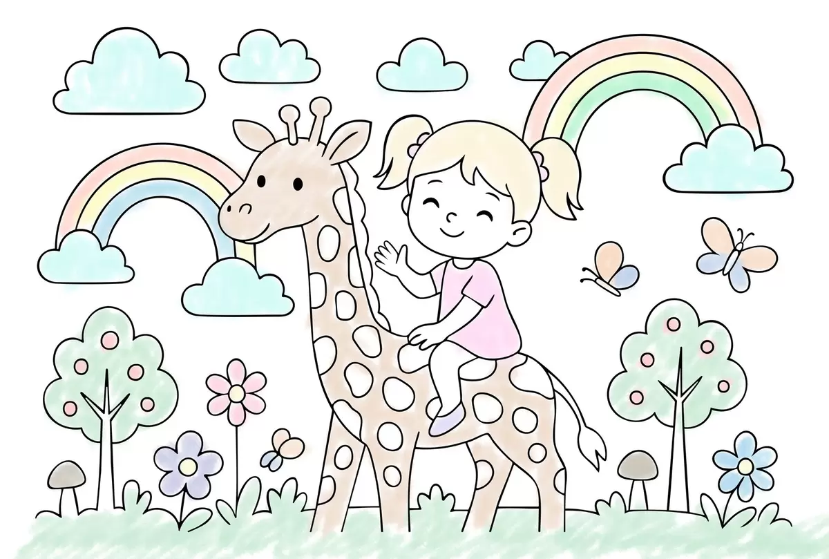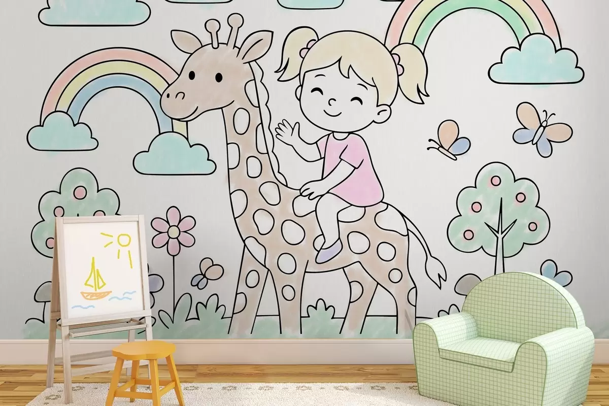 Murais de parede menina em cima de uma girafa no estilo de um livro de colorir infantil Nr. w04755