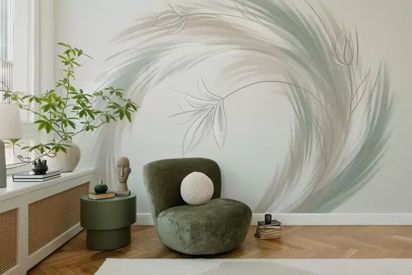 Murais de parede penas e flores verdes e bege, pintadas à mão Nr. w04816