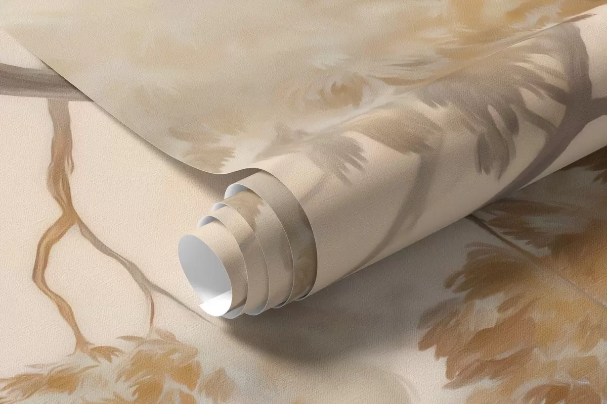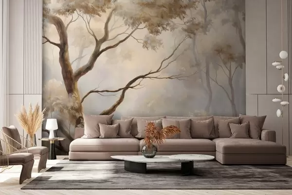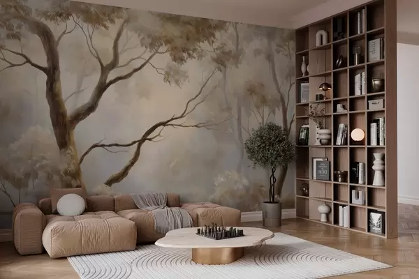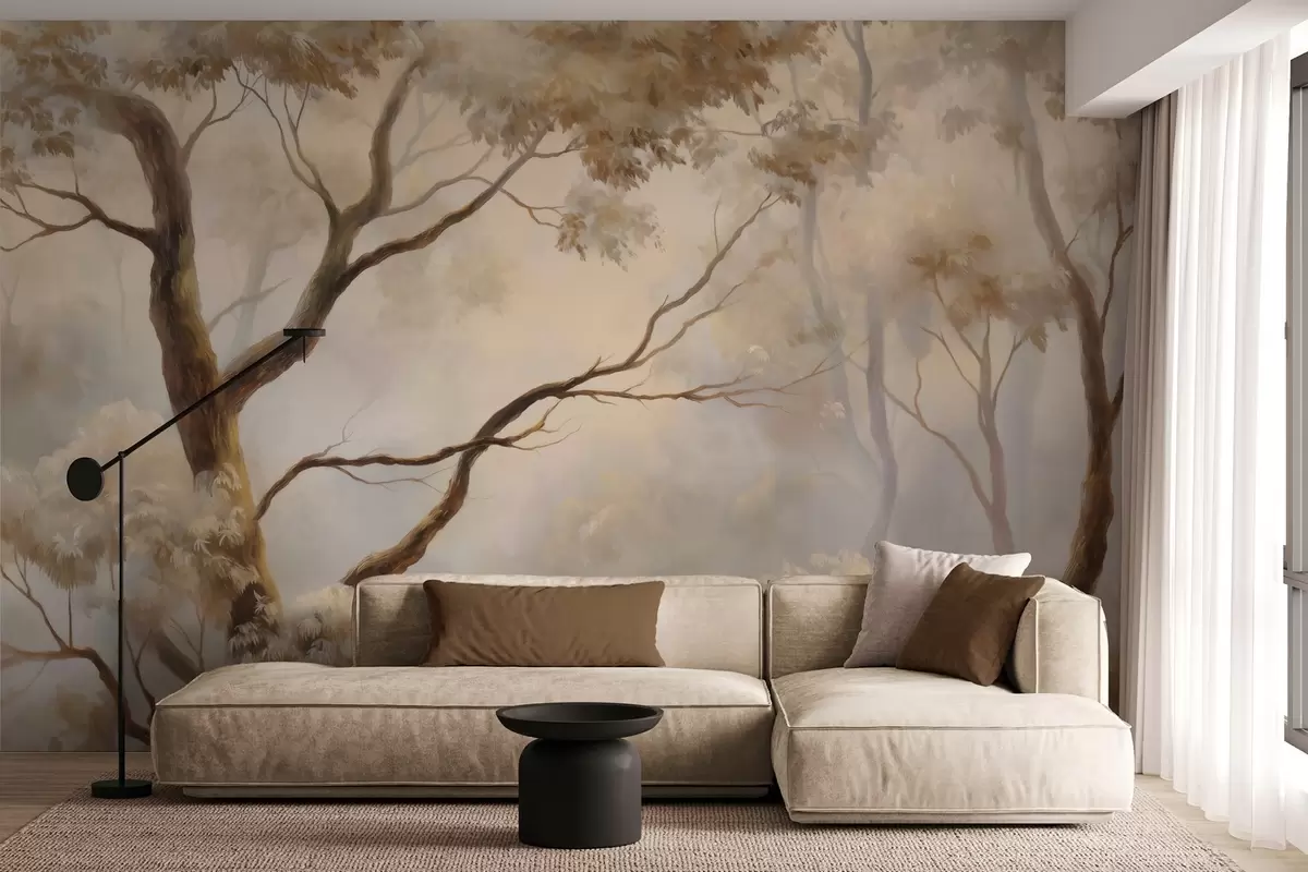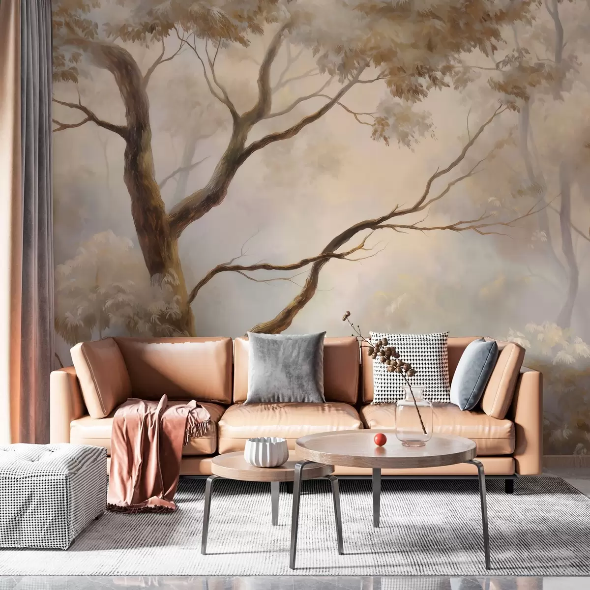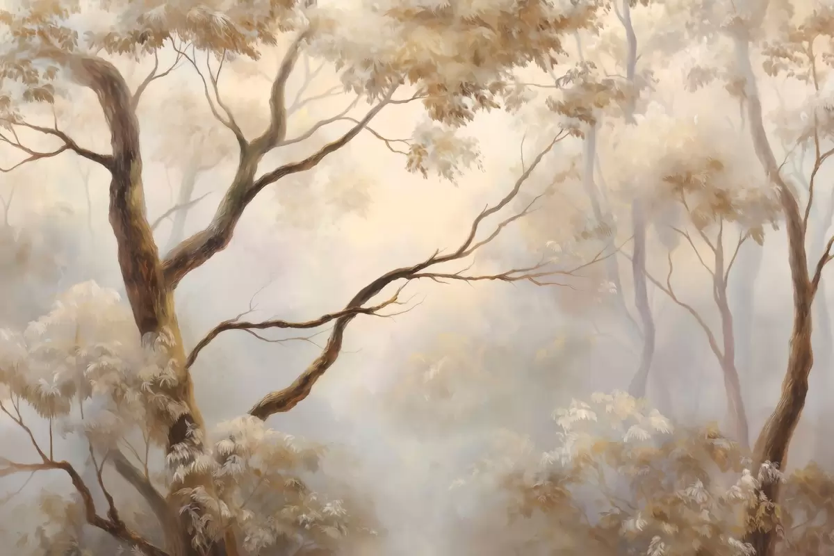 Murais de parede A floresta na leve névoa matinal. Uma pintura atmosférica delicada no estilo de uma paisagem artística. Nr. w04817