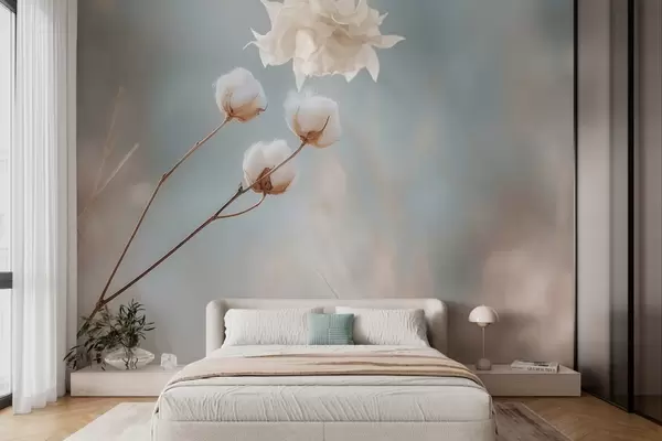 Murais de parede três flores de algodão em um fundo desfocado Nr. w04820