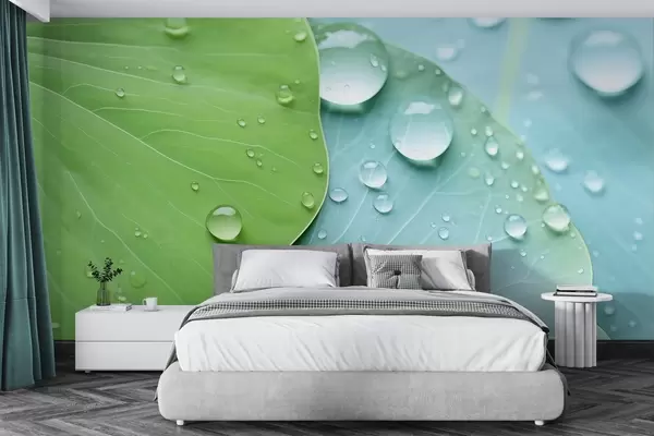murais de parede Gotas de água nas folhas, aquarela macro w04838