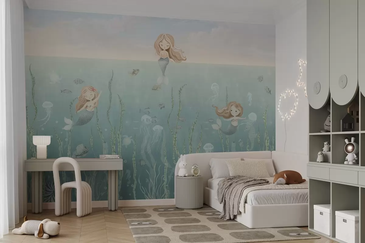 Murais de parede Sereias brincalhonas no fundo do mar com algas, medusas e peixes Nr. w04860