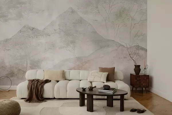 Murais de parede Montanhas e árvores em tons pastéis suaves envoltas em uma leve névoa Nr. w04954