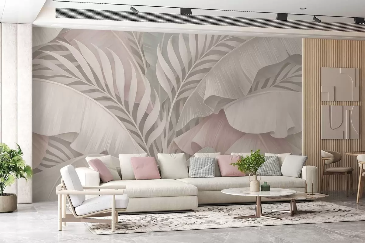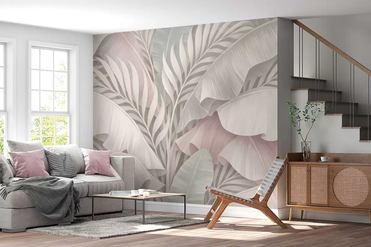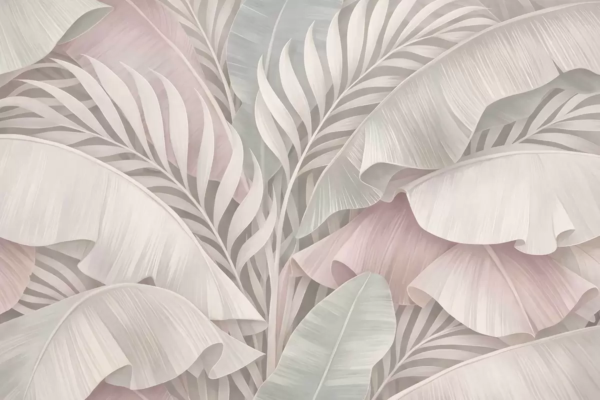 Murais de parede grandes folhas tropicais em tons suaves de rosa e cinza Nr. w05062v1