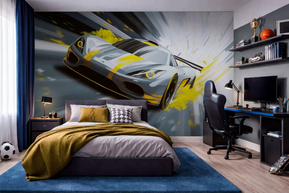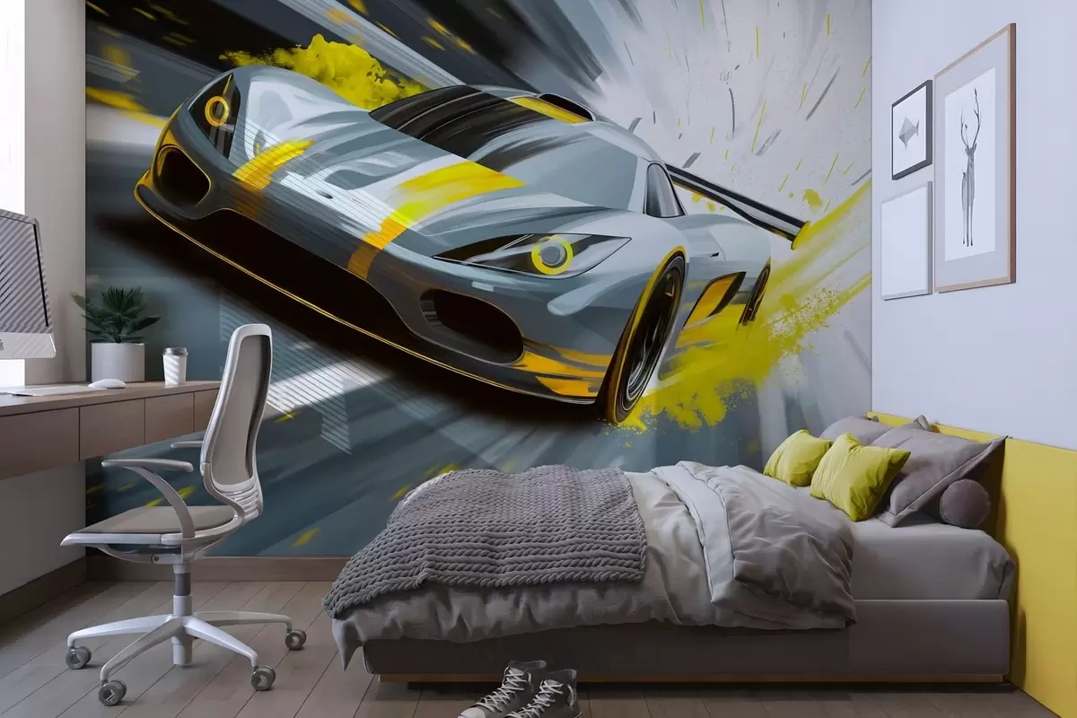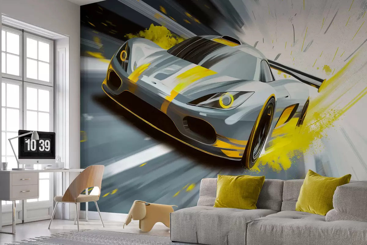 Murais de parede carro esportivo dinâmico em estilo de desenho digital com detalhes em amarelo Nr. w05069v2