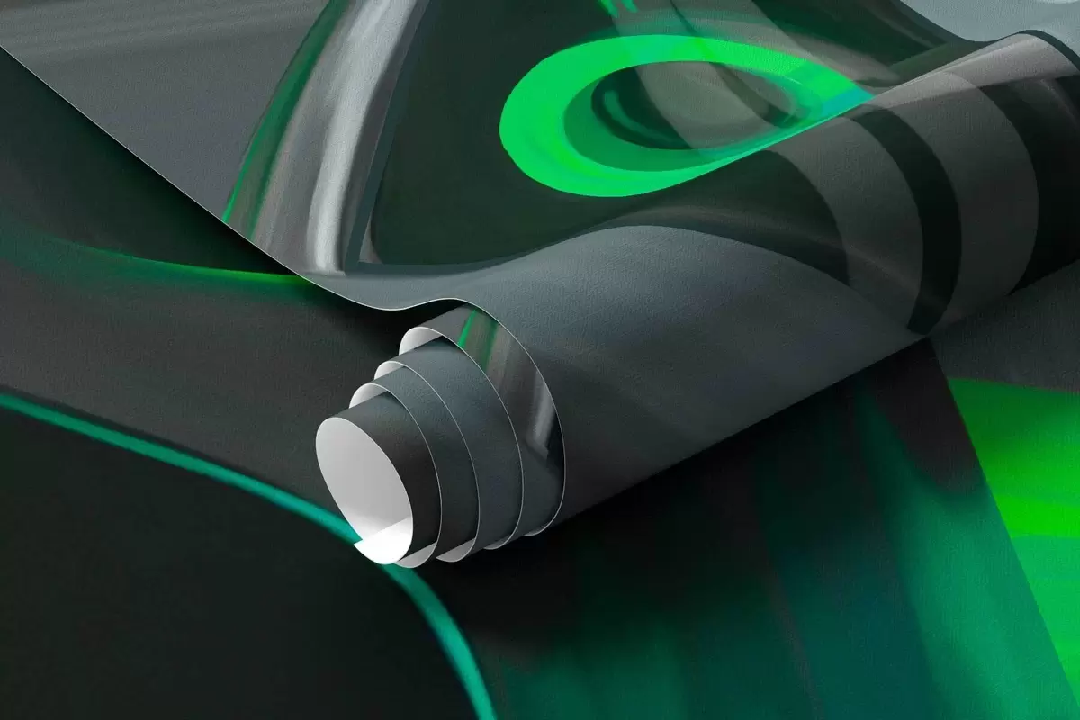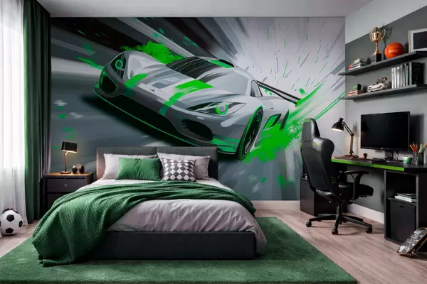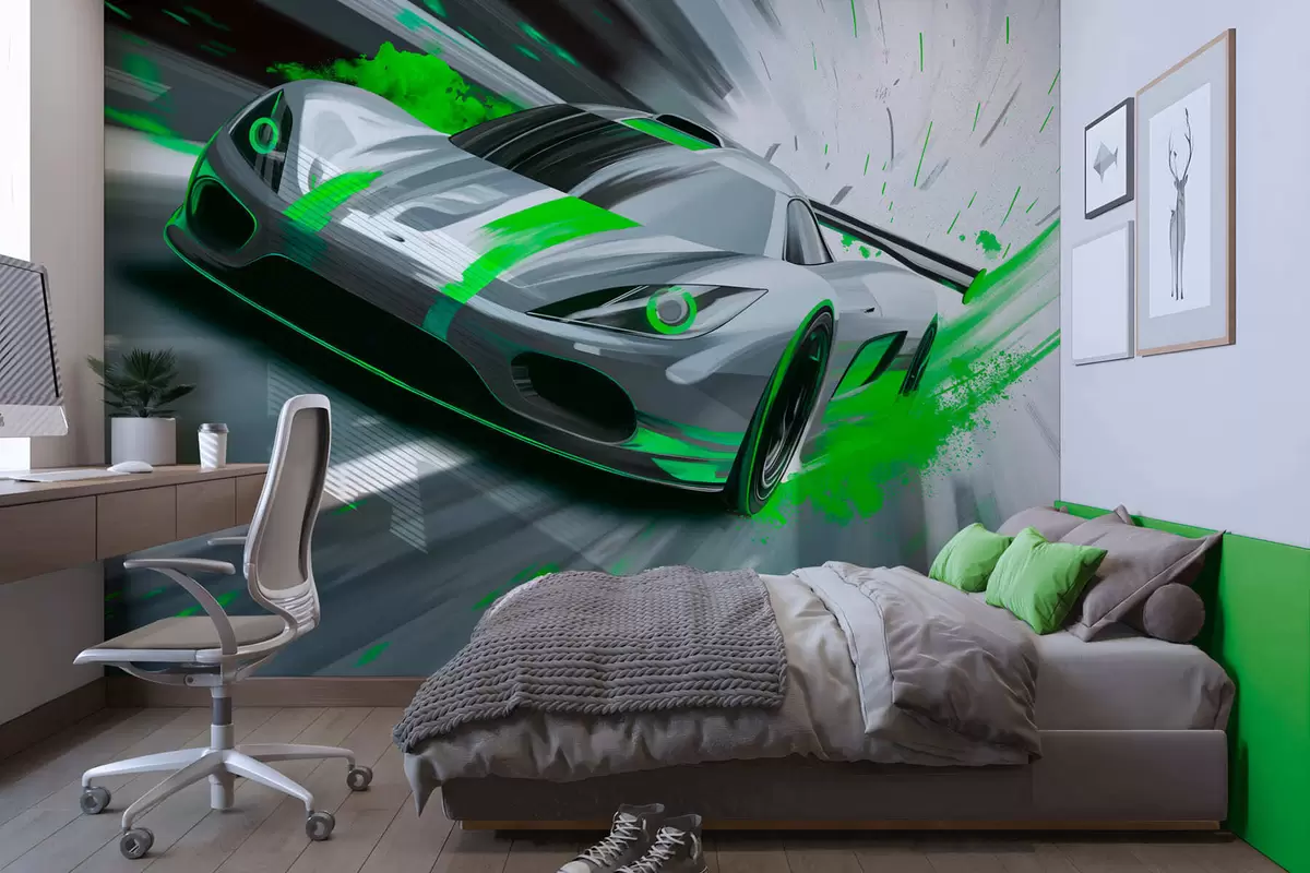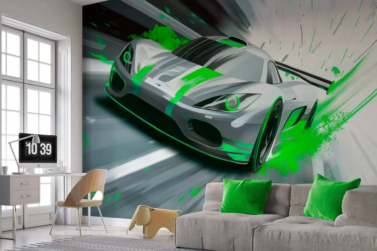 Murais de parede carro esportivo dinâmico em estilo de desenho digital com detalhes em verde Nr. w05069v4
