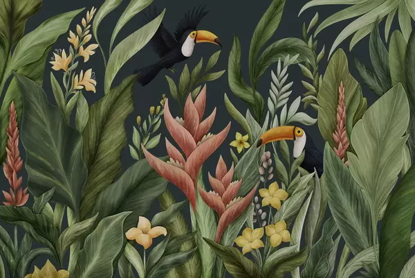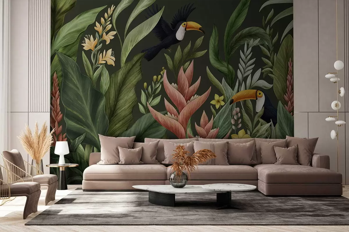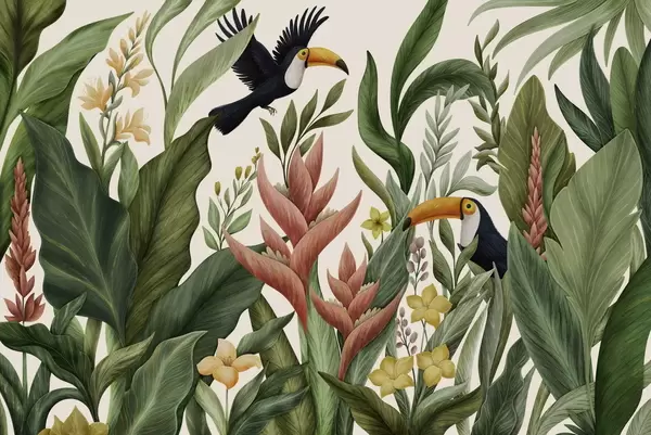 Murais de parede Plantas tropicais e aves de bico grande sobre fundo claro Nr. w05088